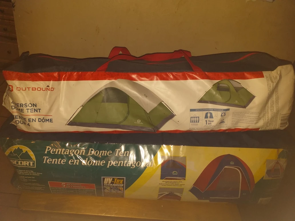 432 Dome tents 5prsn-4prsn-Large cooler&Drink dispenser-3 prsn inflatable boat, Orrs & Pump incl. All old new stock never used !!