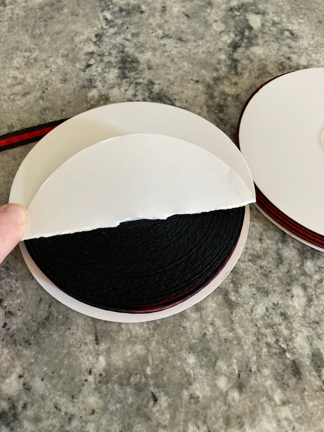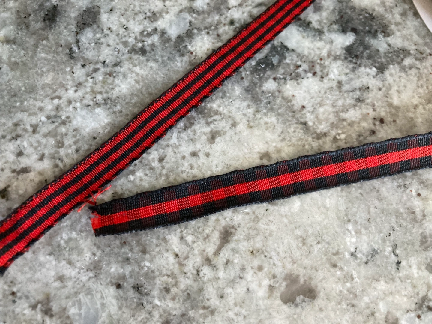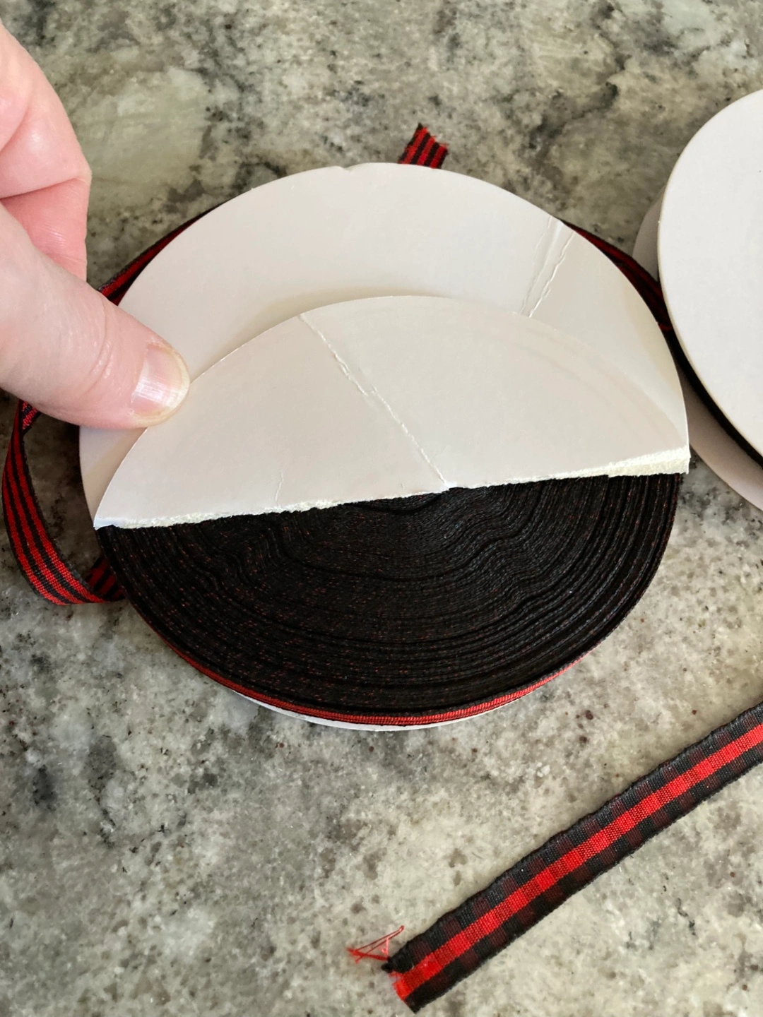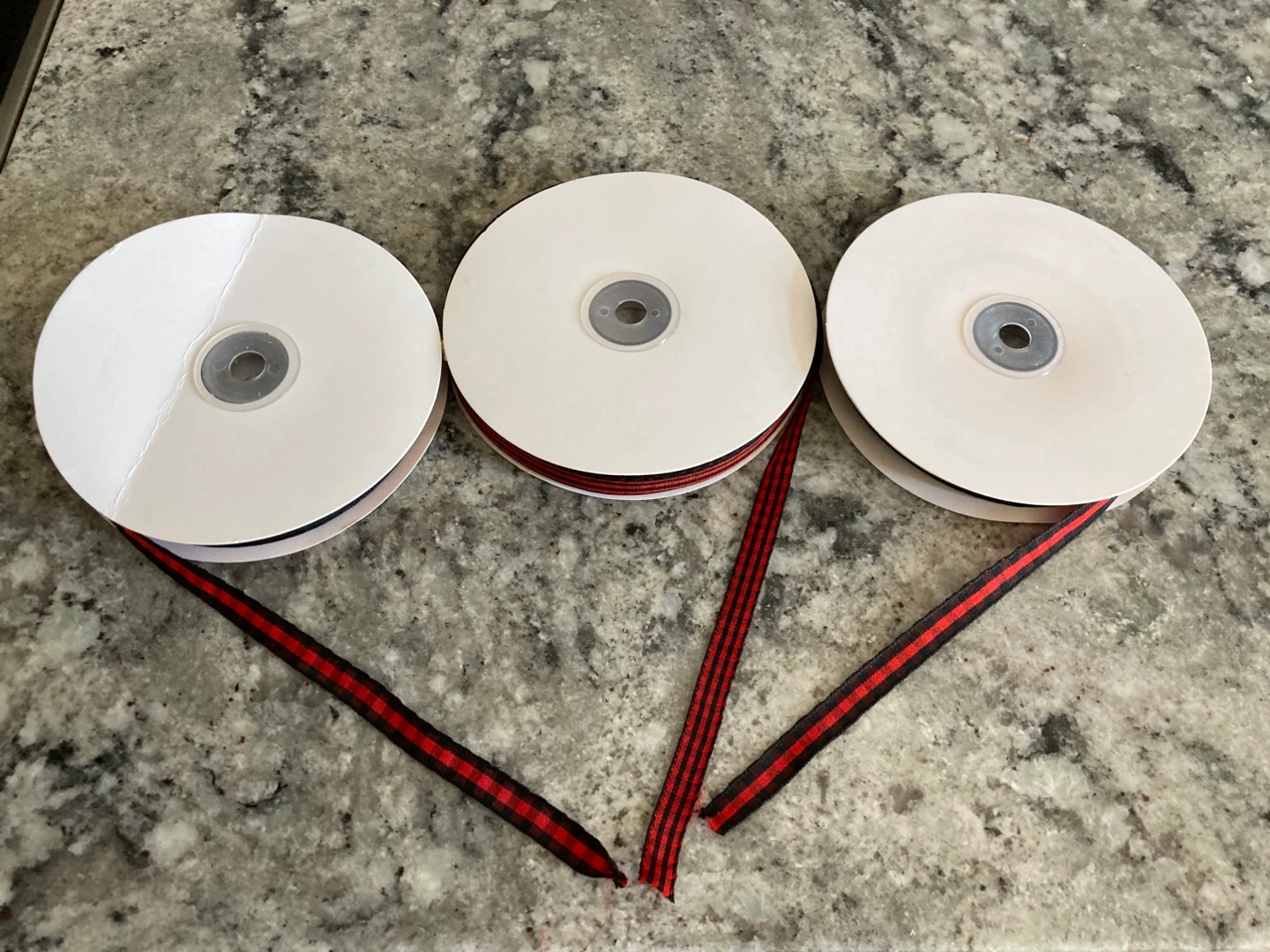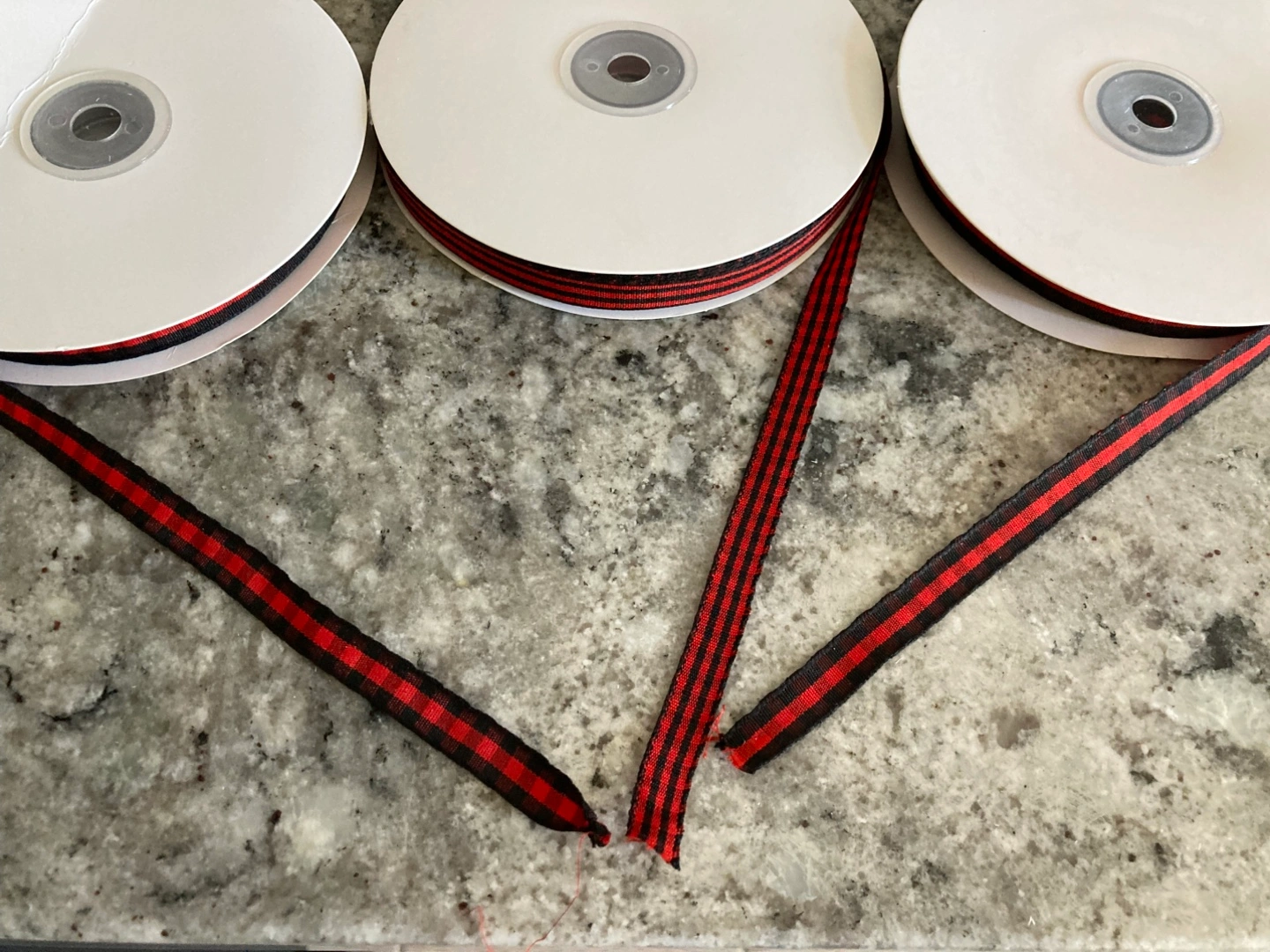 3 new 3/8” wide rolls of red plaid fabric ribbon. 2 styles. 50 yards per roll. $5 each roll. Stouffville pickup