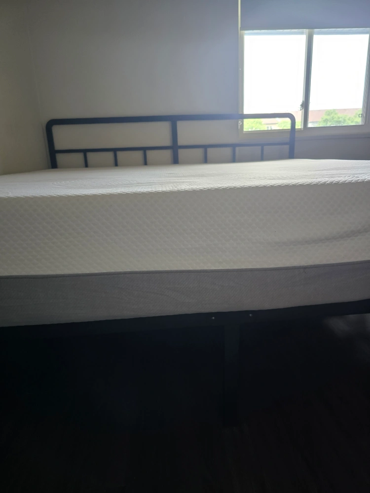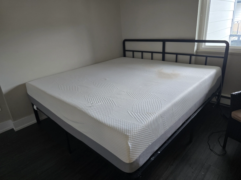 Listing price has been reduced by 100$ now Selling a king size 12 inch cooling gell memory foam bed along with sturdy metal bed frame. Bed has a coffee stain- 250$ Bed Frame with headboard - 100$