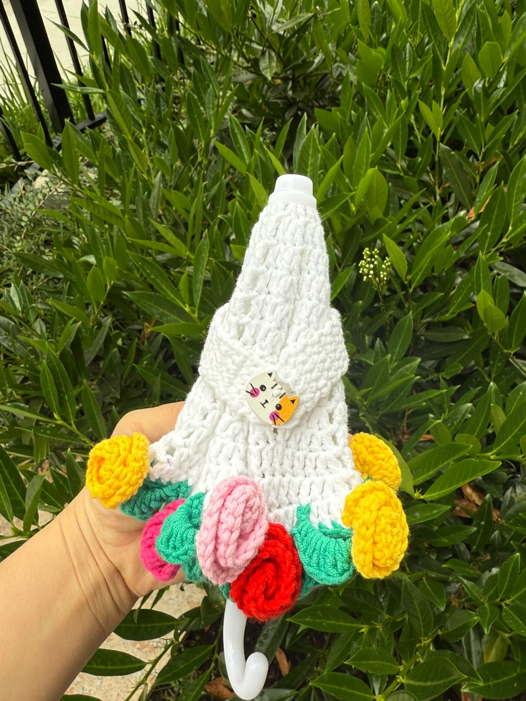 Check out this adorable, handmade crocheted umbrella! It features a charming white crocheted canopy, trimmed with colourful crocheted flowers. Perfect for adding a touch of whimsy to any occasion!