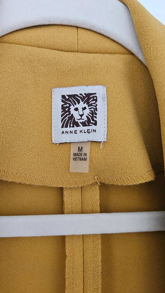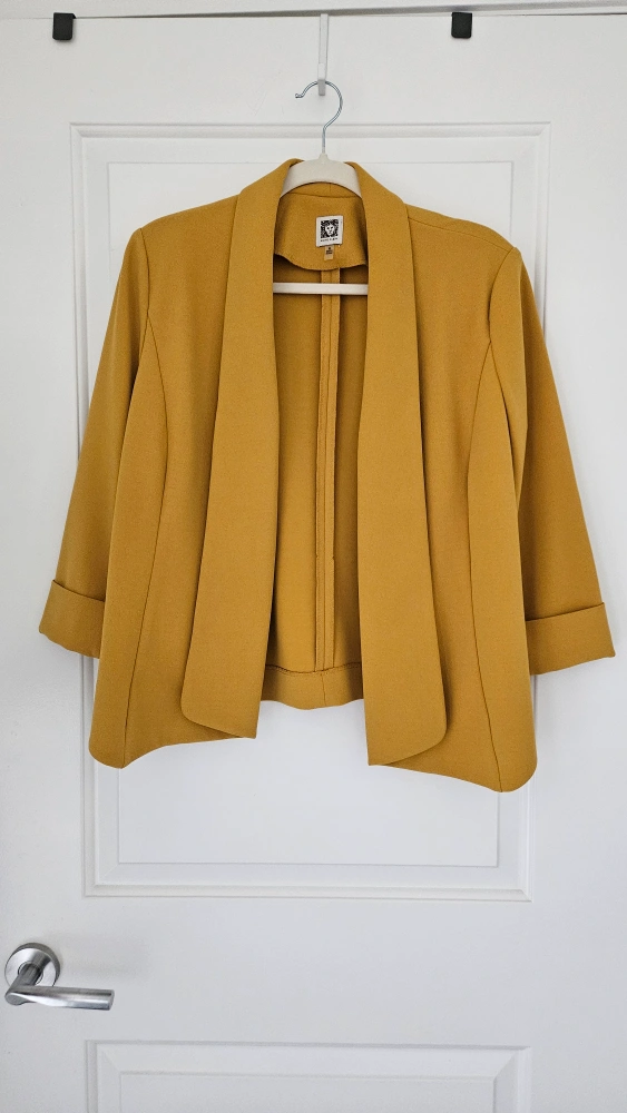 Price is NEGOTIABLE. Here's a lovely Anne Klein blazer in a size medium (note that this fits as a big medium or large)! It features a unique open-front design and a beautiful mustard yellow colour, perfect for adding a pop of colour to any outfit. It's in great condition and ready for a new home. Perfect for work, dress up or down for this summer!