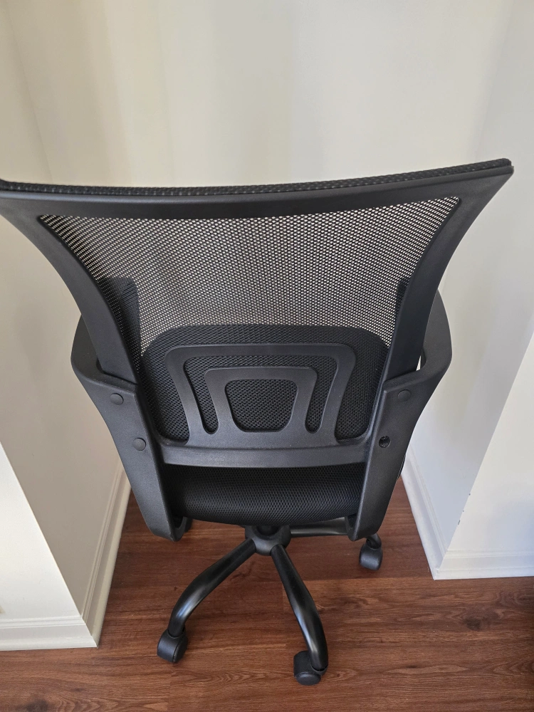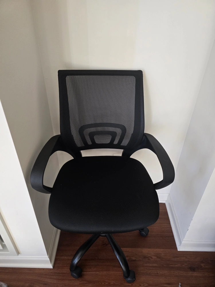 Selling a comfortable black mesh office chair! It's in good condition and perfect for working from home or studying. The mesh back provides good ventilation, and the chair is adjustable for height. It's a simple and functional chair!
