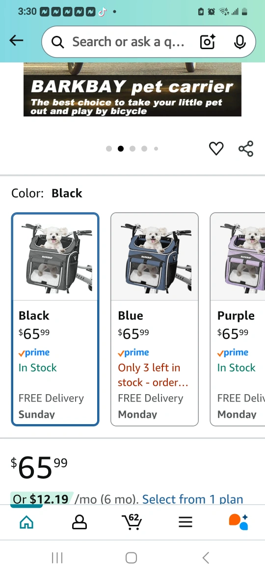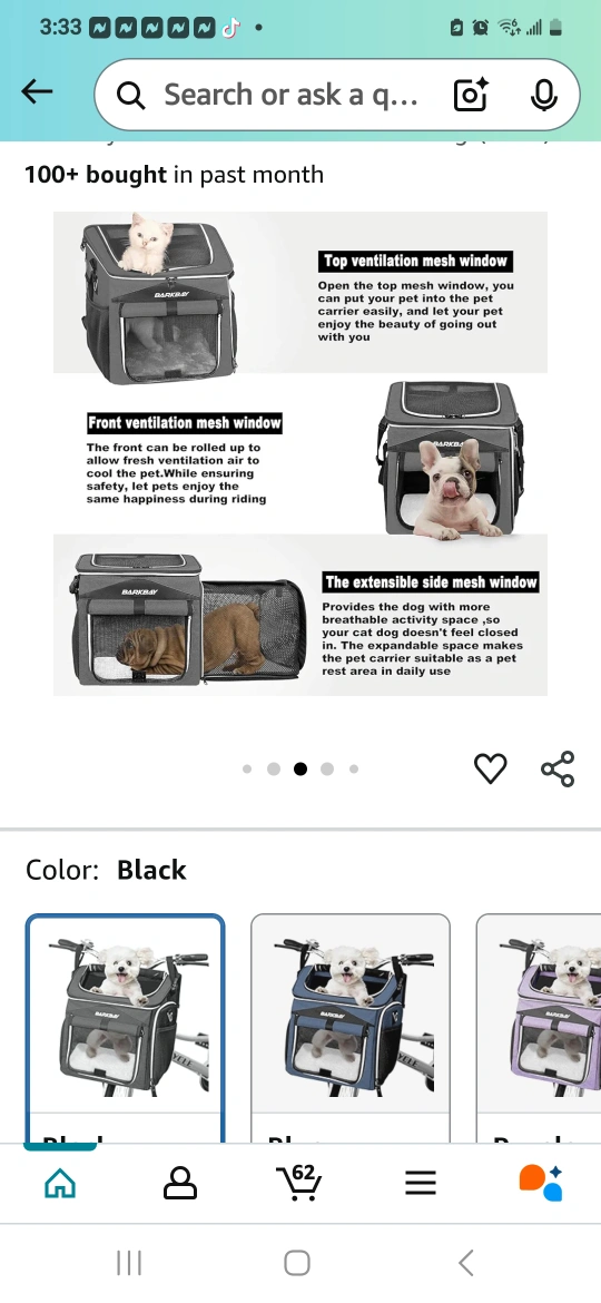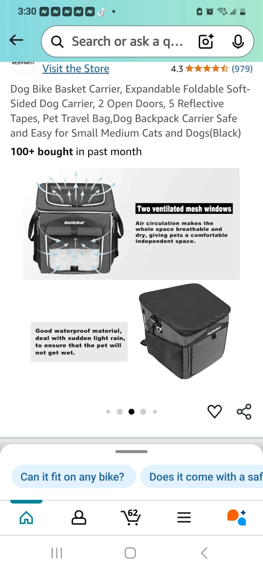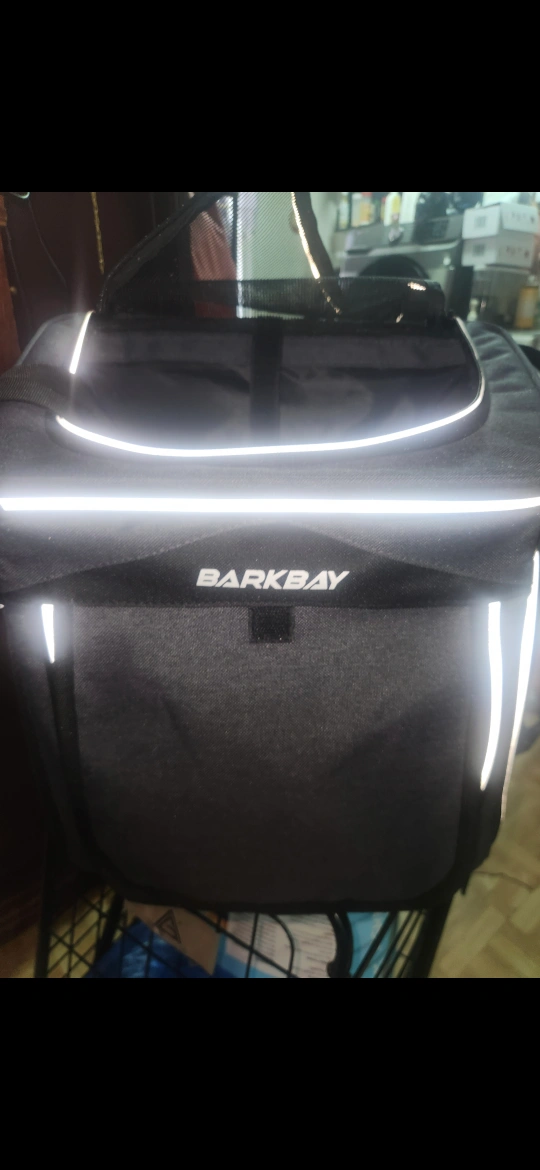 This is a BARKBAY dog bike basket carrier in black. It's expandable and foldable, with two open doors and five reflective tapes. It's a safe and easy way to bring your small cat or dog on bike rides. It features two ventilated mesh windows for air circulation, waterproof material, and extensible side mesh windows
