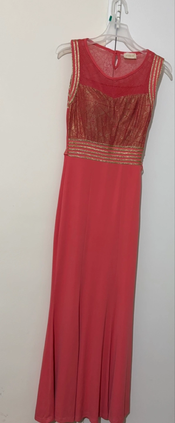 This lovely coral maxi dress features a gold lace bodice and gold trim at the waist and straps. It's perfect for a special occasion or a night out