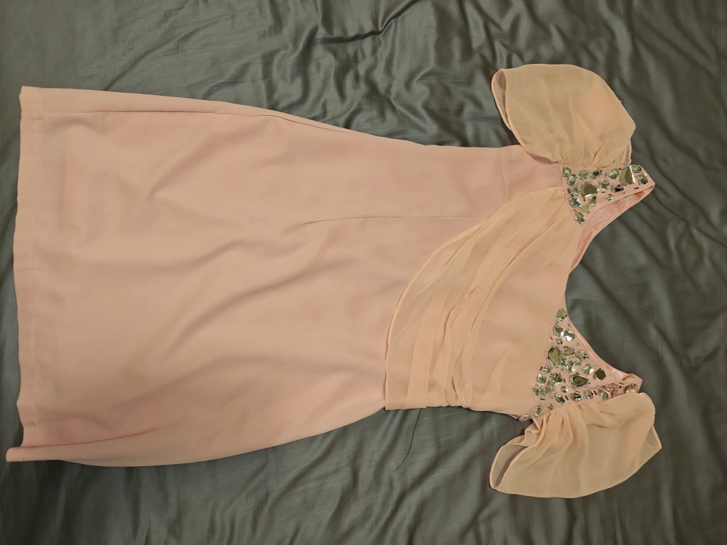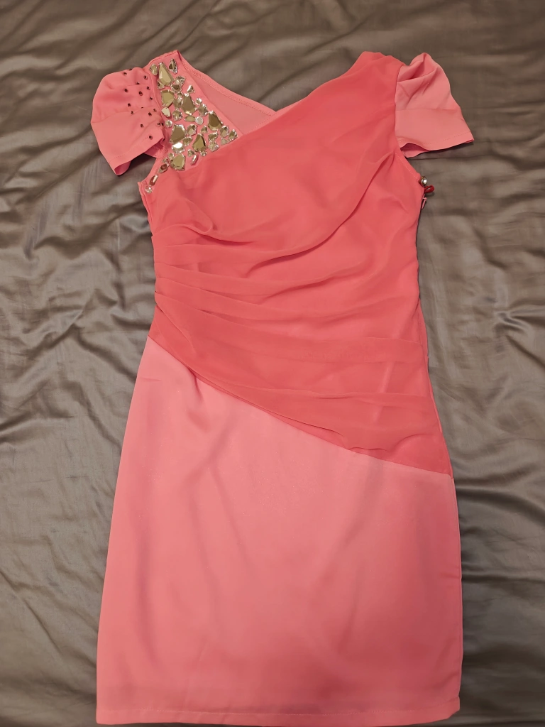 Selling a cute pink party dress! It has some nice detailing around the neckline and shoulder area. It's in great condition and ready for a new home!
