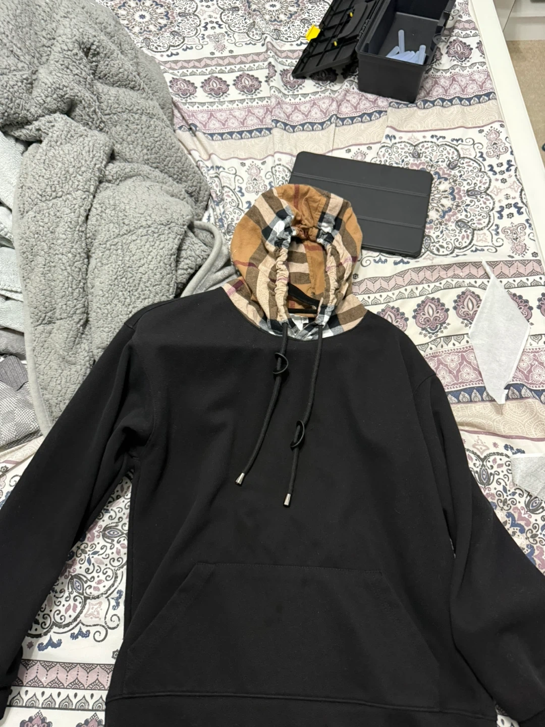 Black Burberry hoodie featuring the iconic check pattern lining the hood. It's made with a soft material for comfort. This hoodie is great for cooler weather or casual wear.
