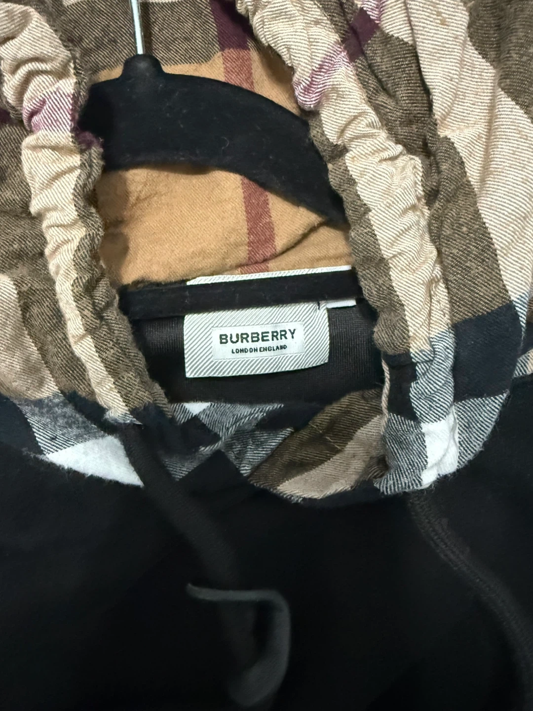 Black Burberry hoodie featuring the iconic check pattern lining the hood. It's made with a soft material for comfort. This hoodie is great for cooler weather or casual wear.