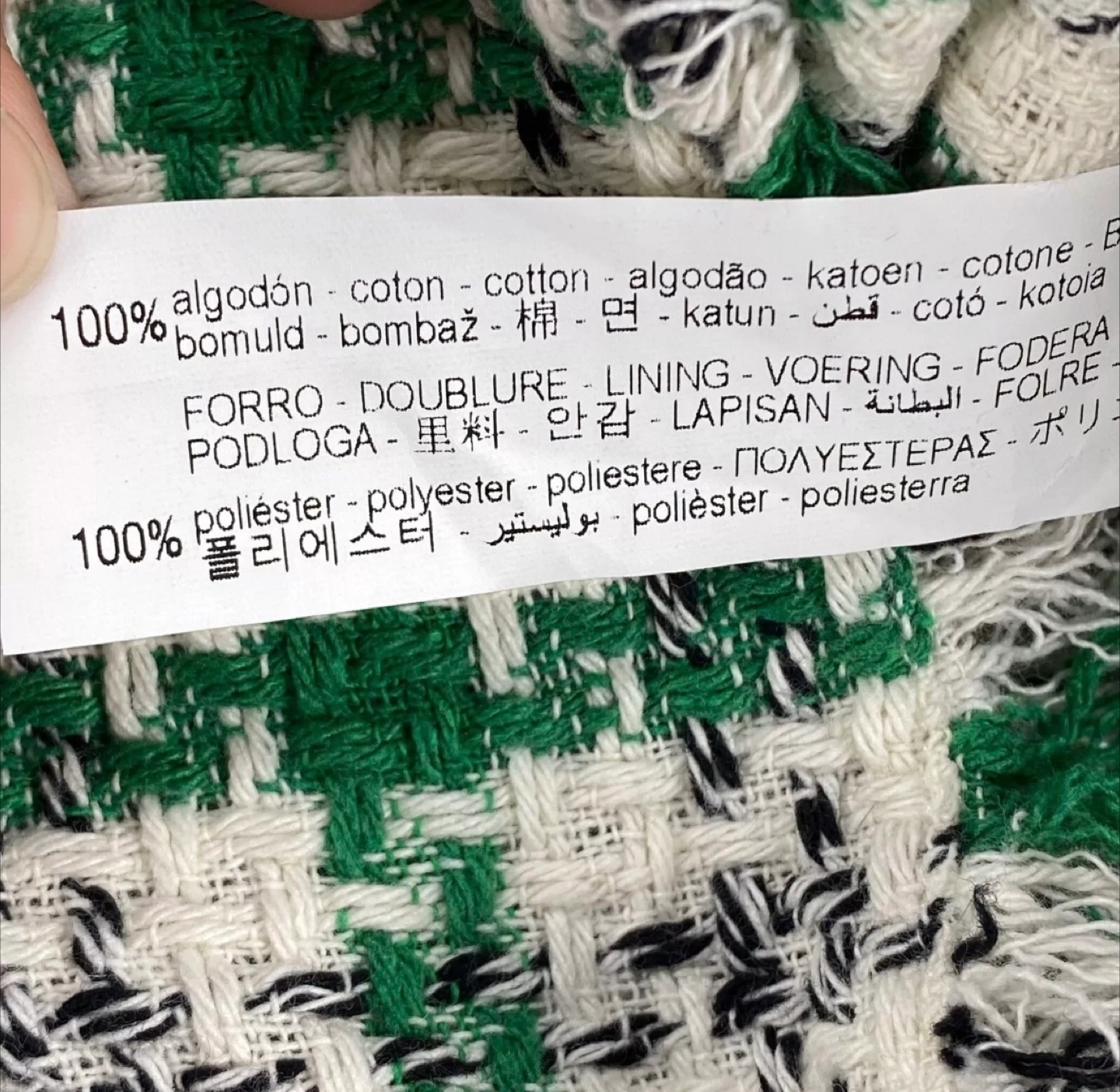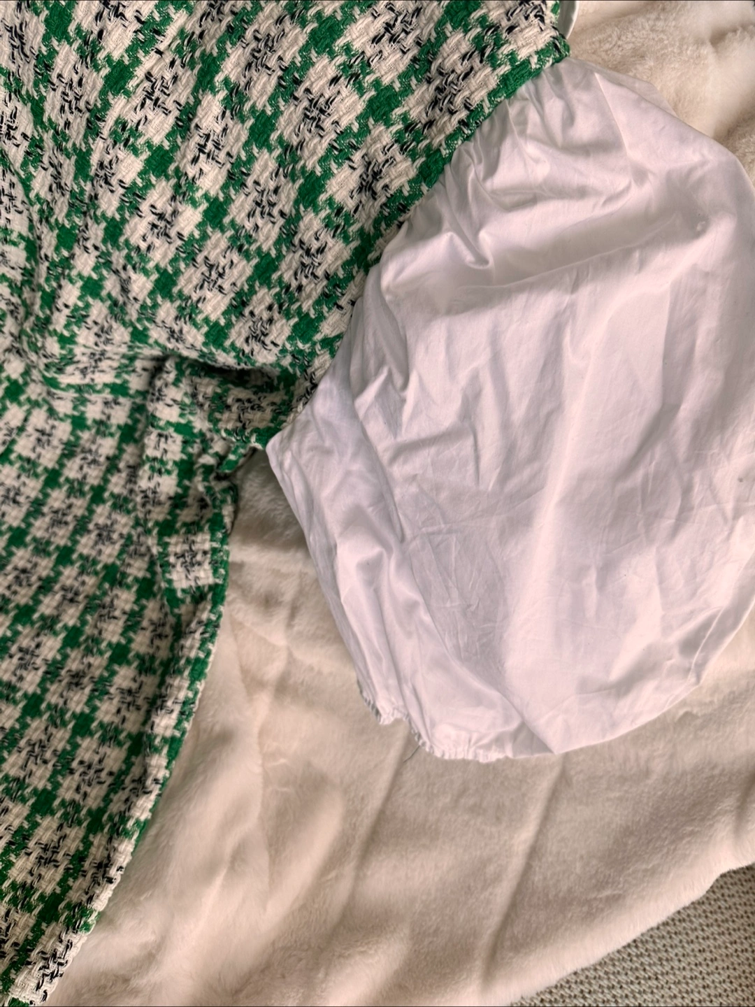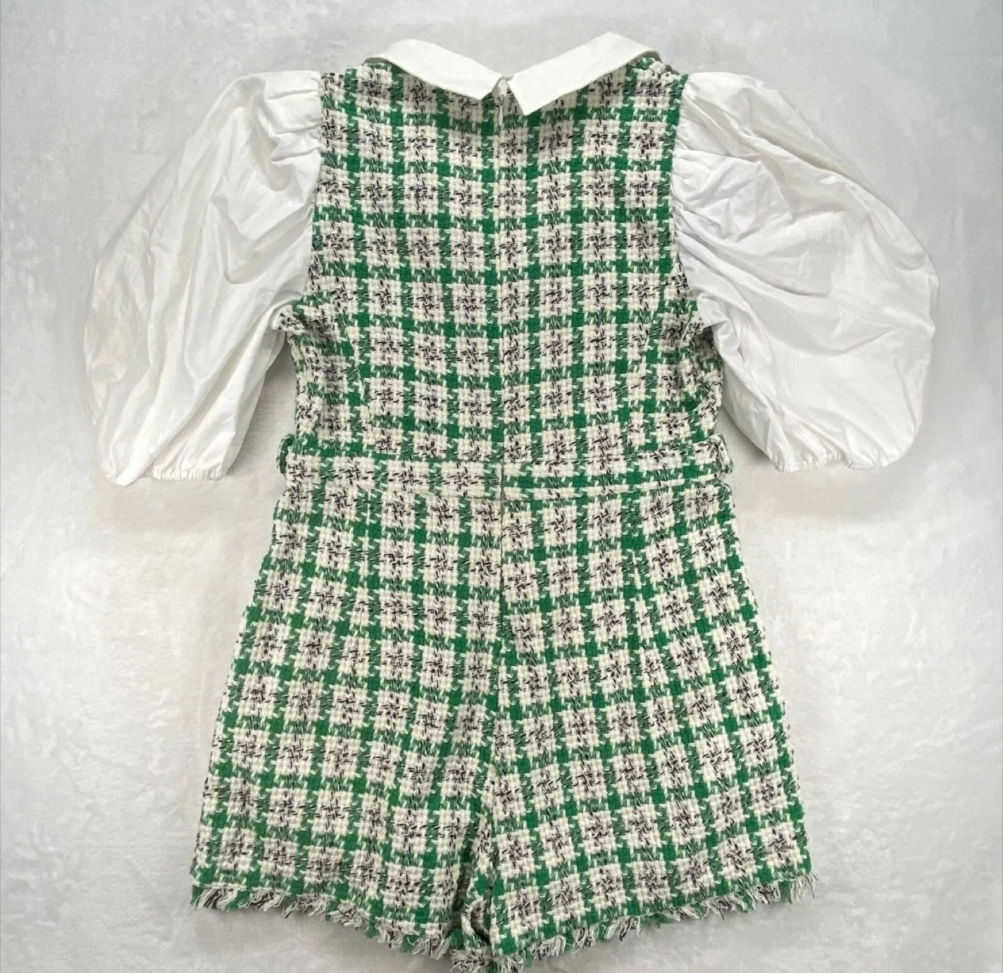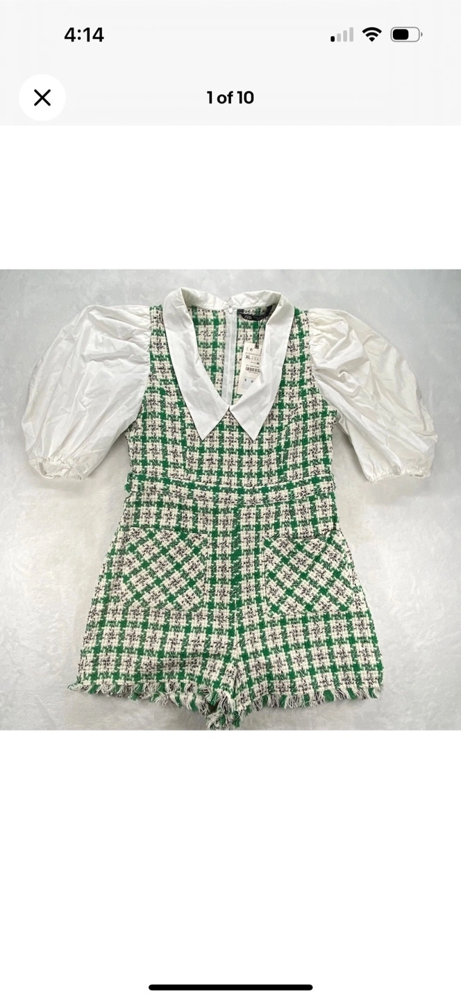 This Zara romper is super cute! It features a green and white tweed pattern with puffy white sleeves and a collared neckline. It's a size L and made of cotton and polyester.