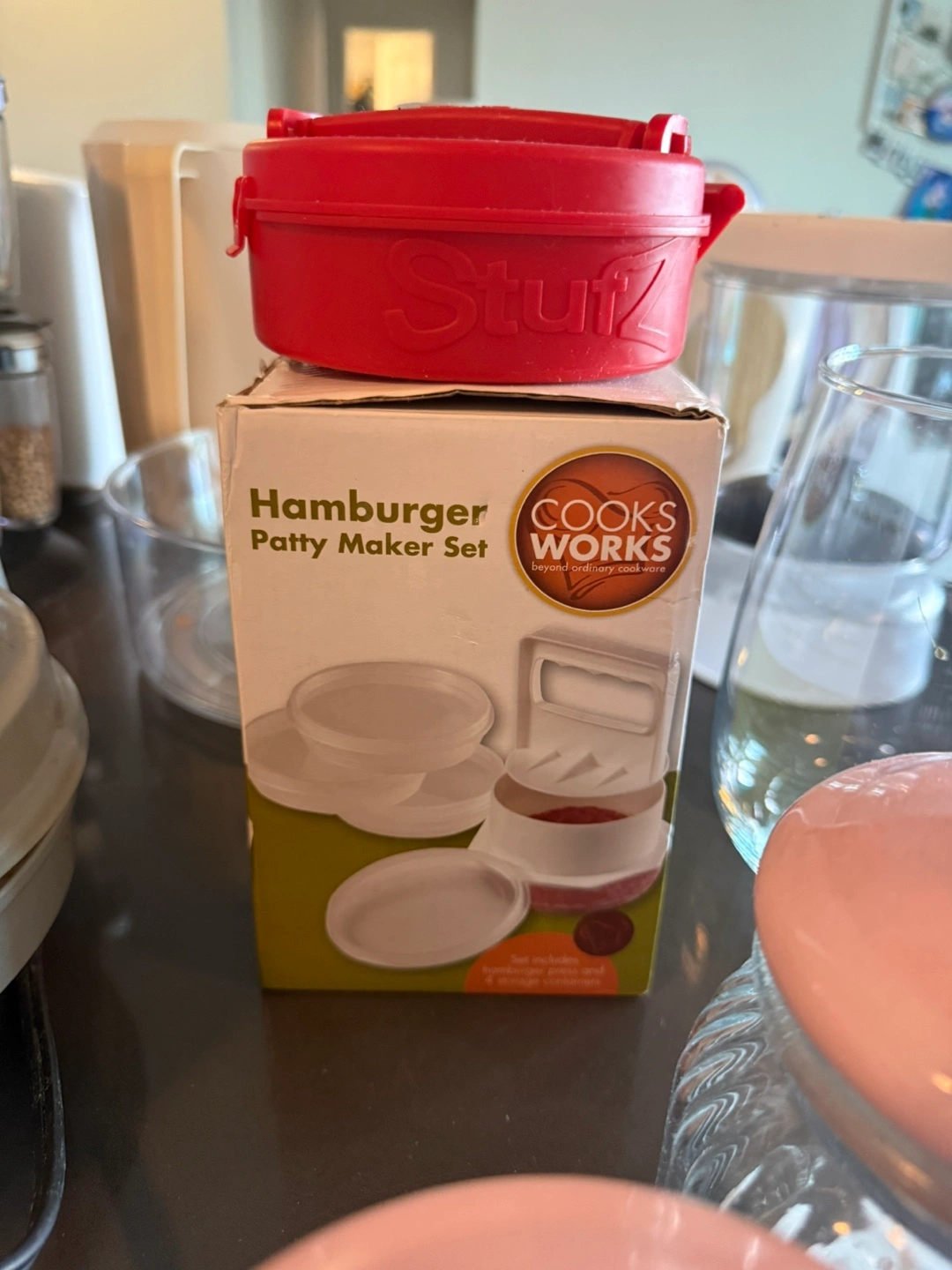 Hamburger Patty Maker Set by Cooks Works. The box says the set includes hamburger press and 4 storage containers