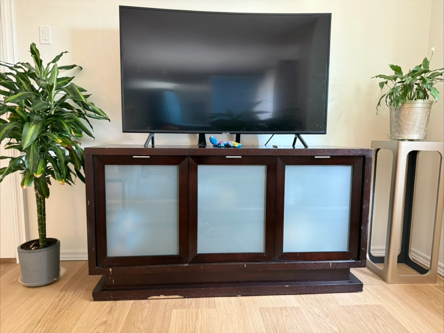 Selling a dark brown entertainment unit. It has frosted glass doors and shelving inside. Has a hidden drawer that I love. There are some signs of wear and tear, it got beat up in our recent move but it’s a very sturdy (also very heavy) wooden piece. With a little TLC it could look like new.