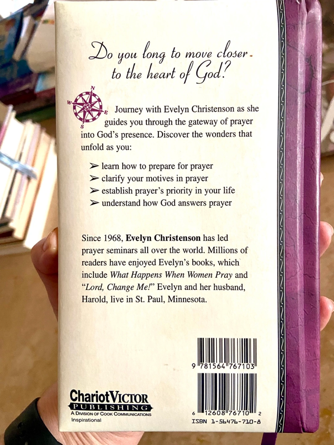 Evelyn Christenson has led prayer seminars all over the world since 1968. Millions of readers have enjoyed Evelyn's books, which include What Happens When Women Pray and "Lord, Change Me!"