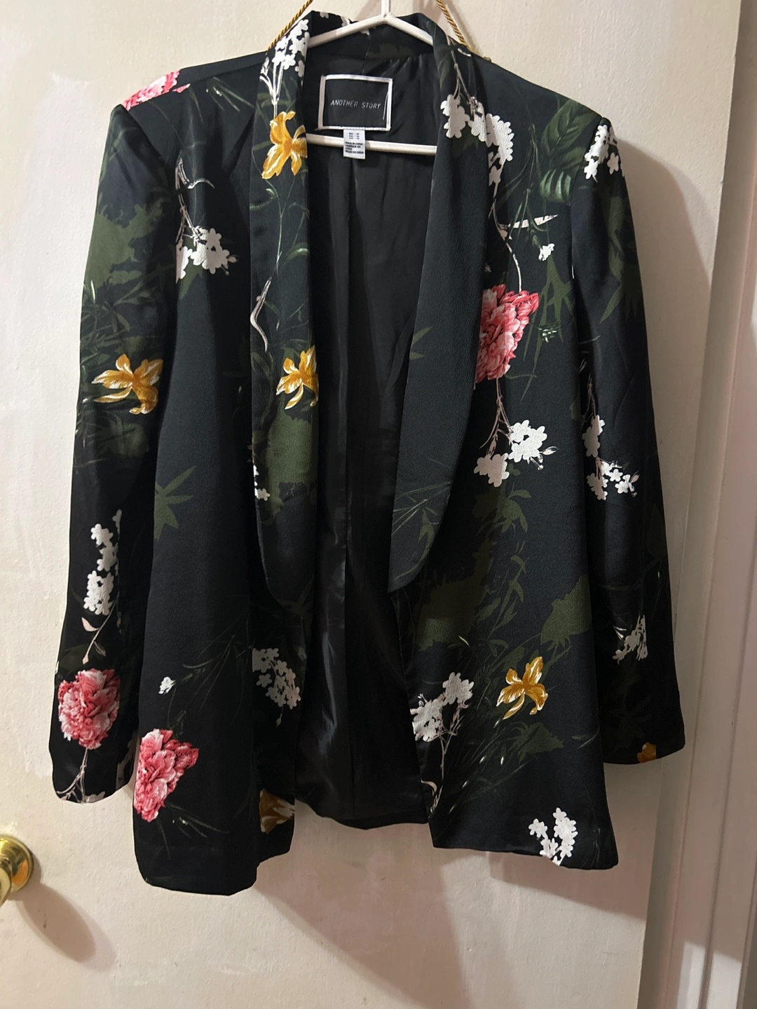 Selling a gently used Another Story blazer in size M. It features a beautiful floral print on a black background, perfect for adding a touch of elegance to any outfit