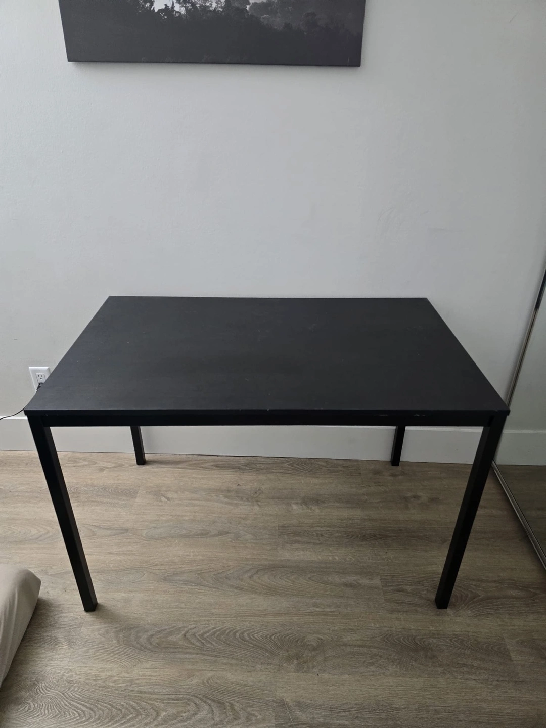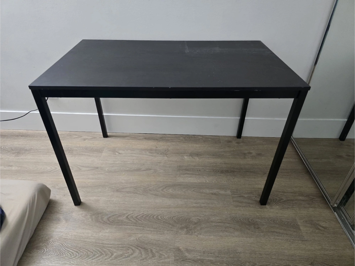Selling a simple black dining table. It's in good condition and perfect for a small space or apartment. Would work great as a desk too! Comes with 2 chair