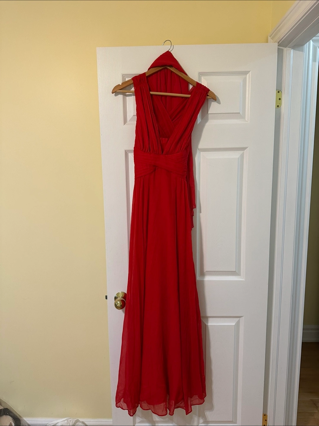 Beautiful red flowy maxi dress with criss cross back. Worn once. Comes with a matching scarf. Great for special occasions.