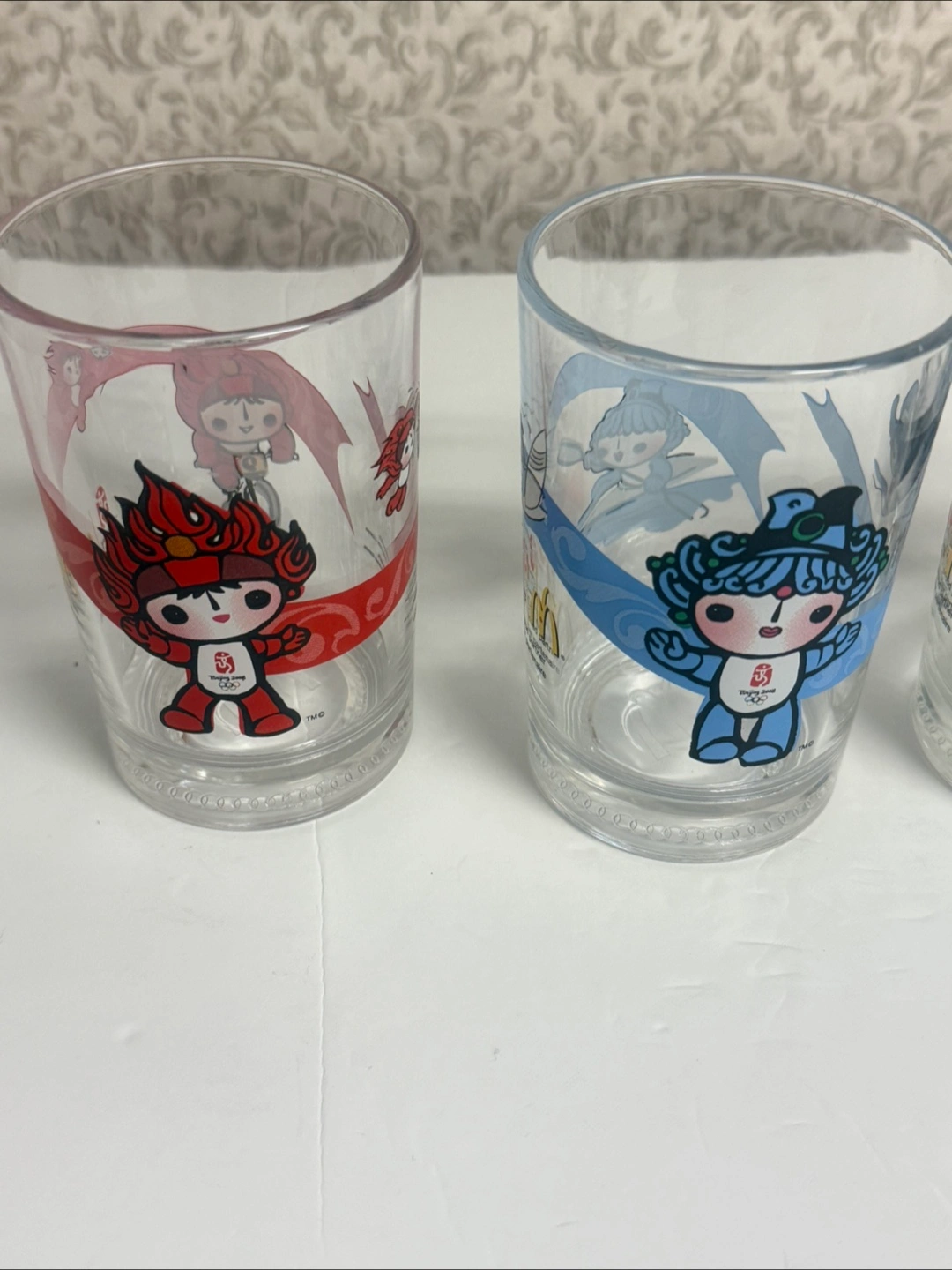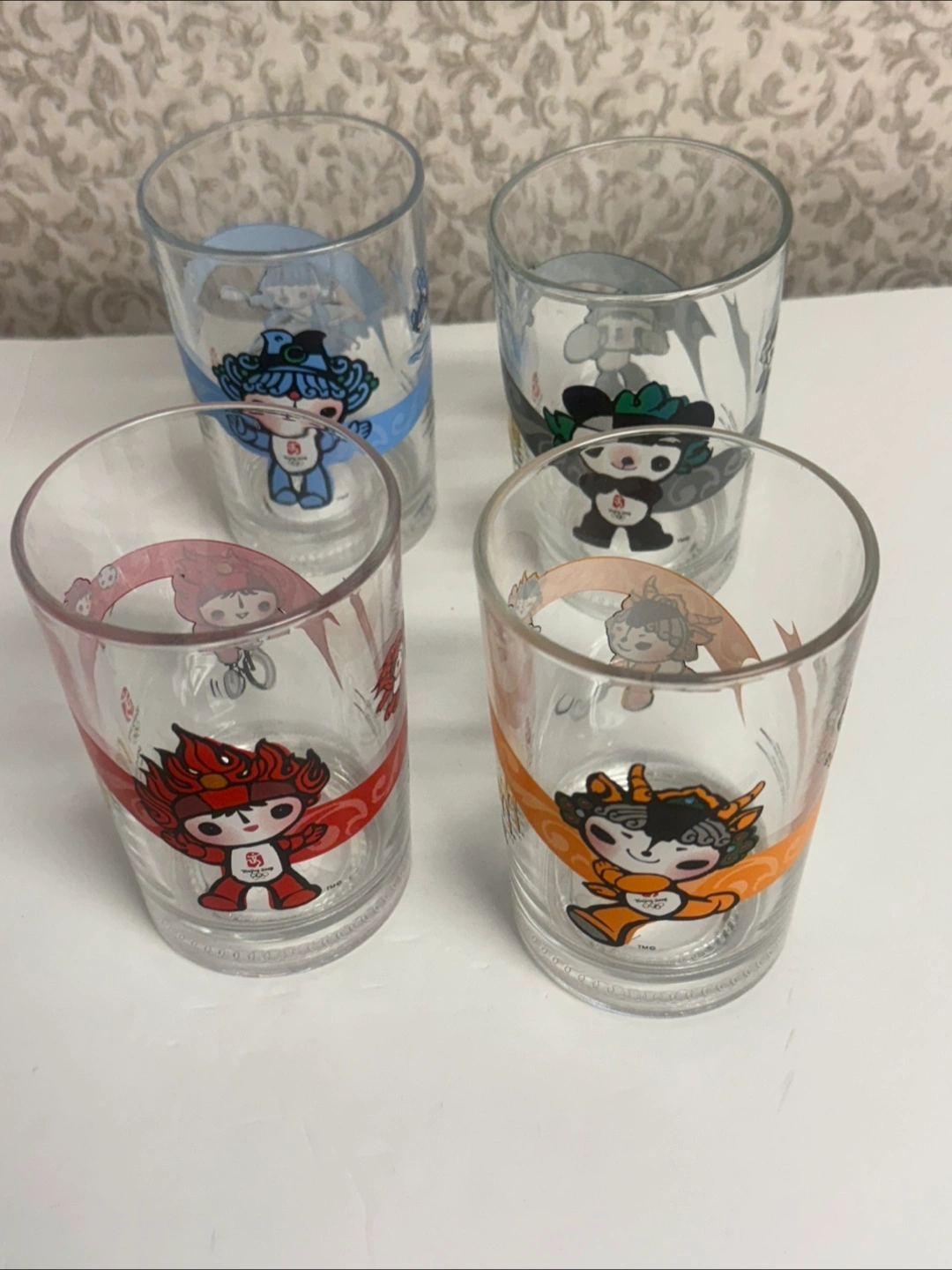 Selling a set of four new glasses featuring the mascots from the Beijing 2008 Olympic Games. These are in great condition and would be perfect for a collector or anyone who loves the Olympics! $15 each