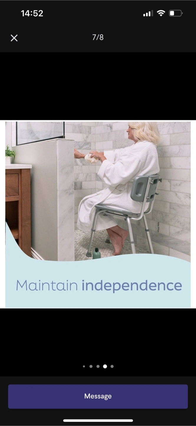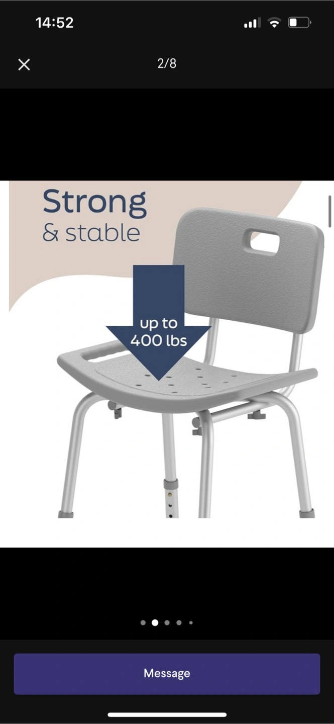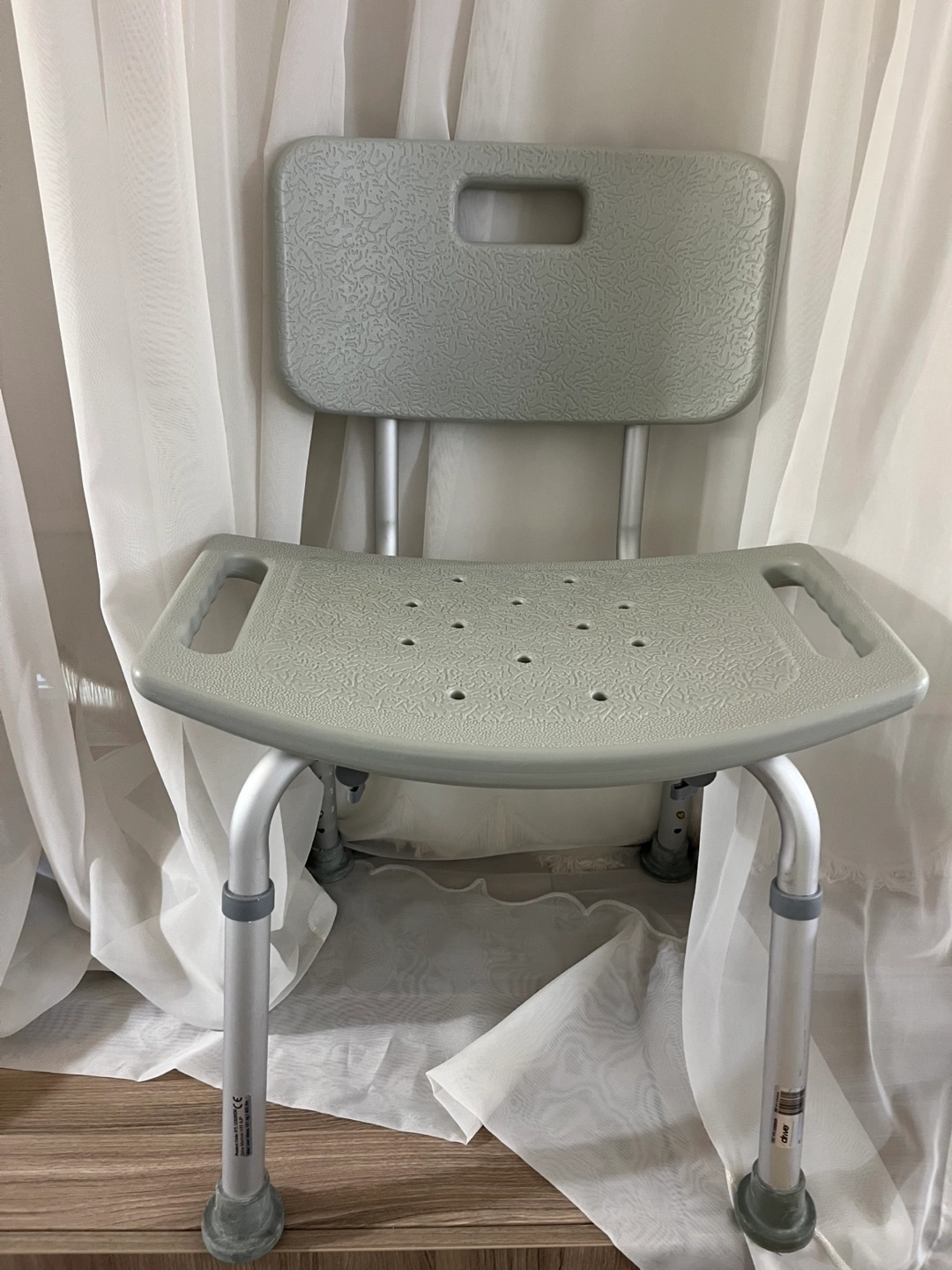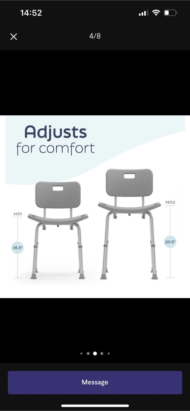 Selling a Drive Medical bath chair in gray. It features a tool-free removable back and adjustable legs for customized comfort. It's strong and stable, supporting up to 400 lbs