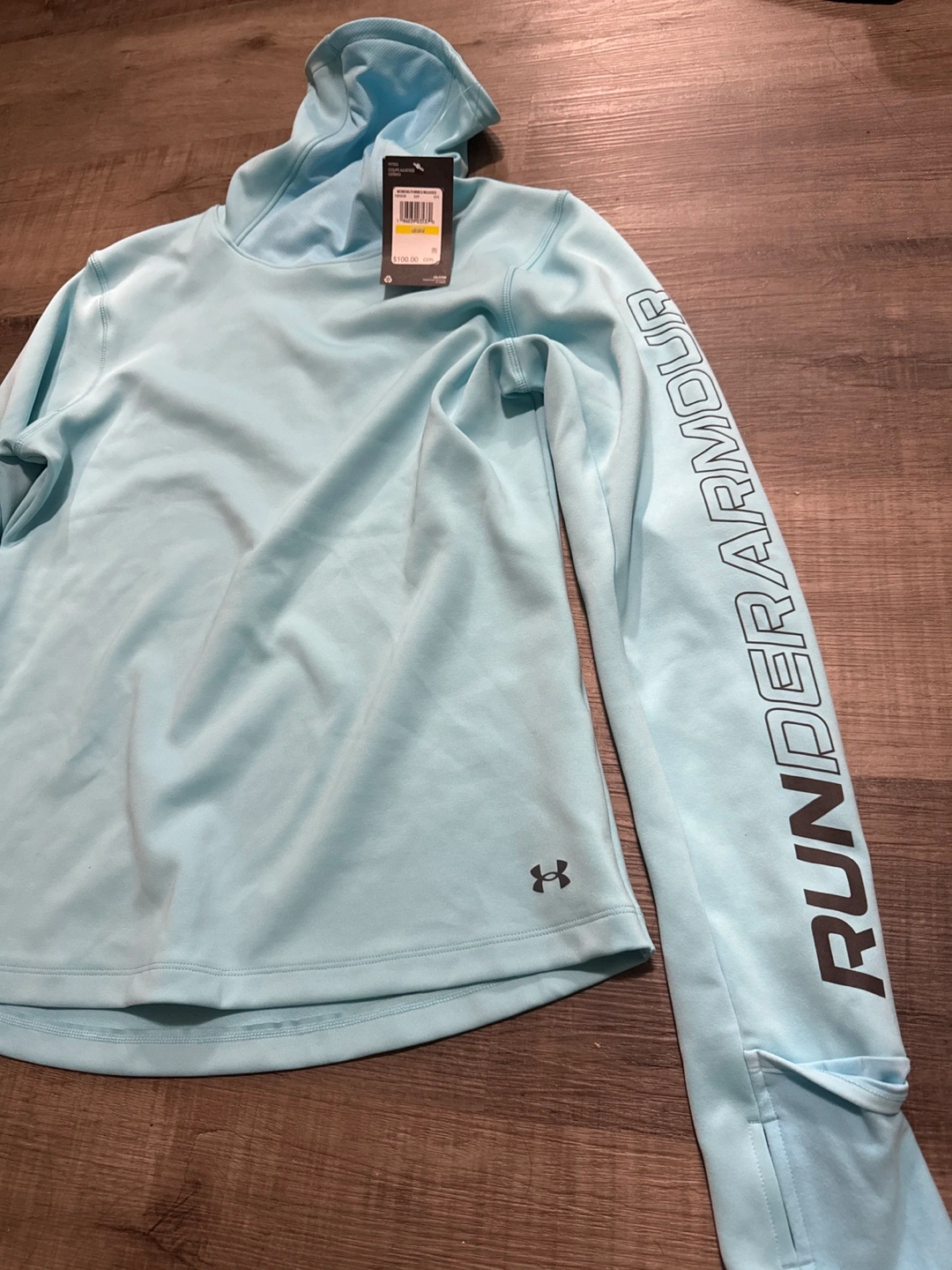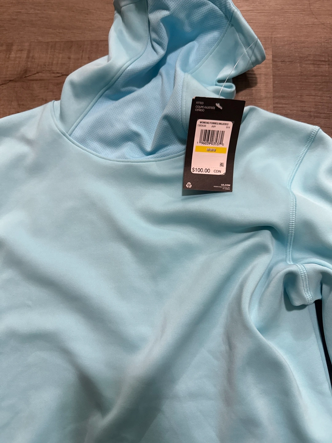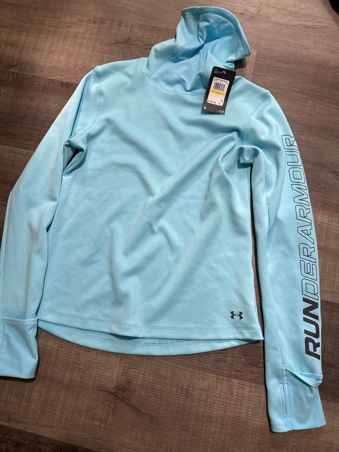 Selling a brand new Under Armour women's Run Coldgear hoodie! It's a lovely light blue colour and has the Under Armour logo on the sleeve. The original price on the tag is $100 CAD