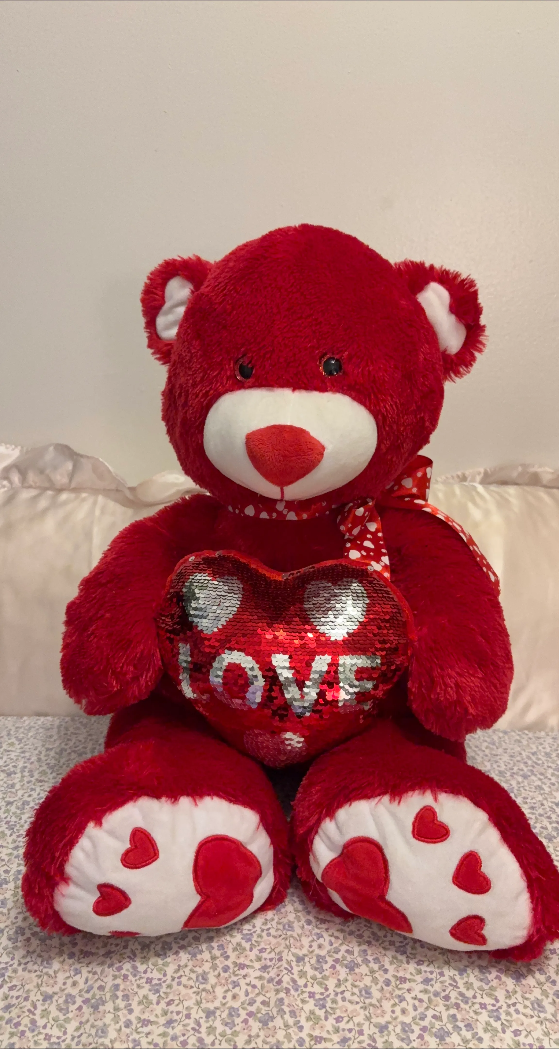 This adorable red teddy bear is looking for a new home! It has a cute sequin heart that says 'LOVE' and a polka dot ribbon around its neck. The bear's feet have sweet little heart details too