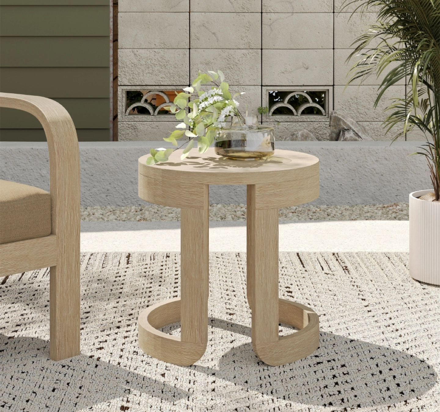 Enhance your outdoor living space with this elegant side table that combines durability with style. Crafted from FSC-certified acacia solid wood frame is built to withstand outdoor use. Featuring round table top to serve drinks or snacks, while the sled base offers sturdy support. Adding this side table to your outdoor seating space that creates a cozy spot where you will certainly enjoy spending leisure time.