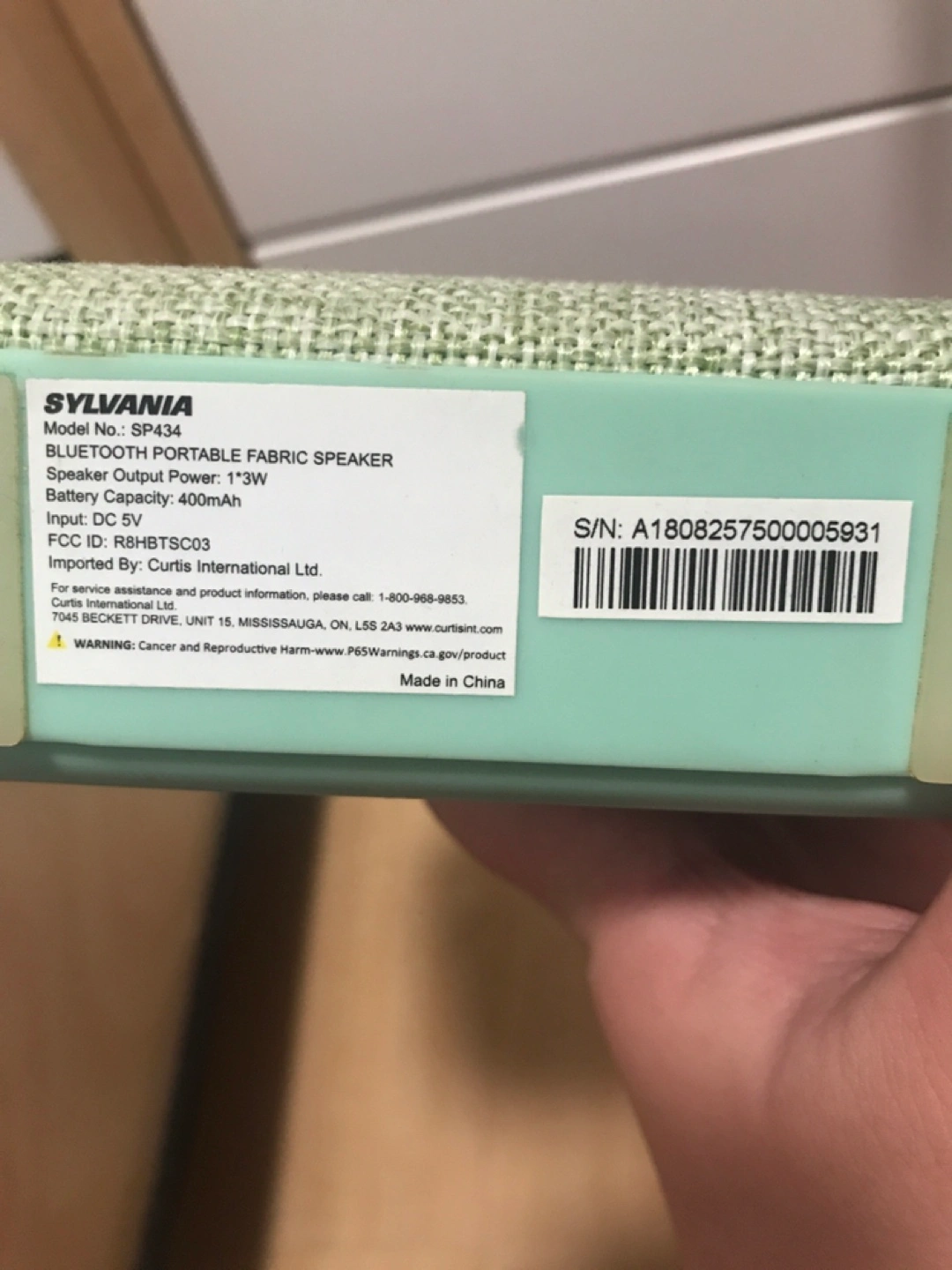 Selling a Sylvania Bluetooth portable fabric speaker, model SP434. It has a speaker output power of 13W and a battery capacity of 400mAh. It's lightweight and portable, perfect for taking your tunes on the go!