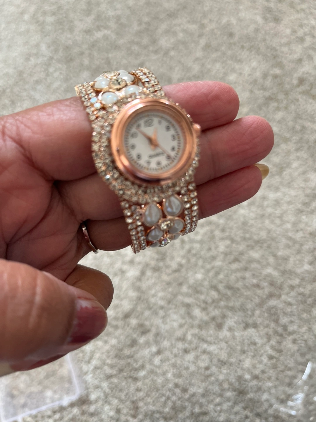 Here's a lovely rose gold tone cuff watch! It comes in its original box. The watch features a decorative cuff design with faux pearls and rhinestones. It's in great condition and ready to add some sparkle to your wrist
