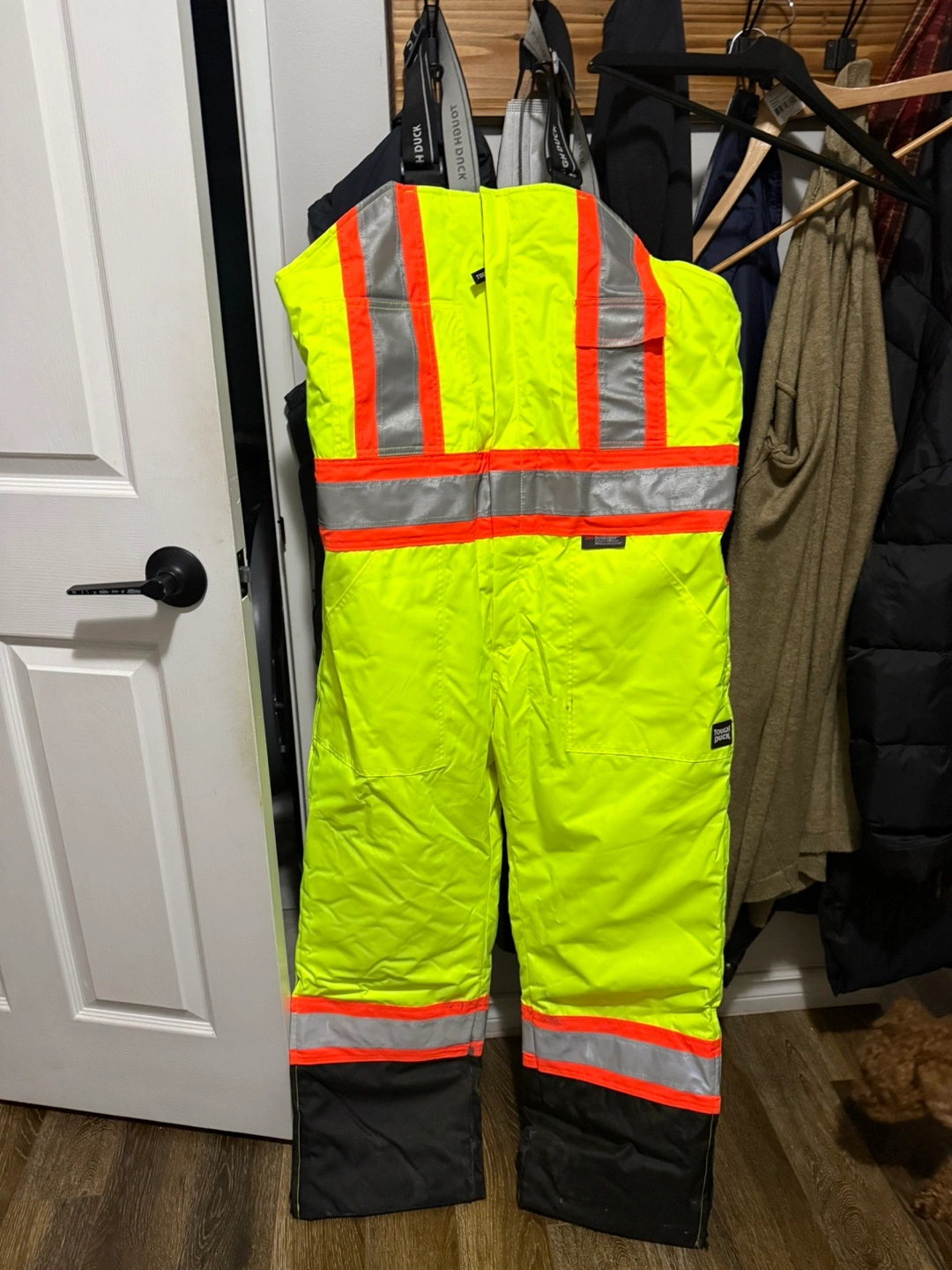 I'm selling a Tough Duck insulated coverall in size L/G. It's perfect for staying warm and visible during outdoor work or activities. The bright yellow colour and reflective stripes ensure you'll be seen, and the insulation will keep you cozy in cold weather