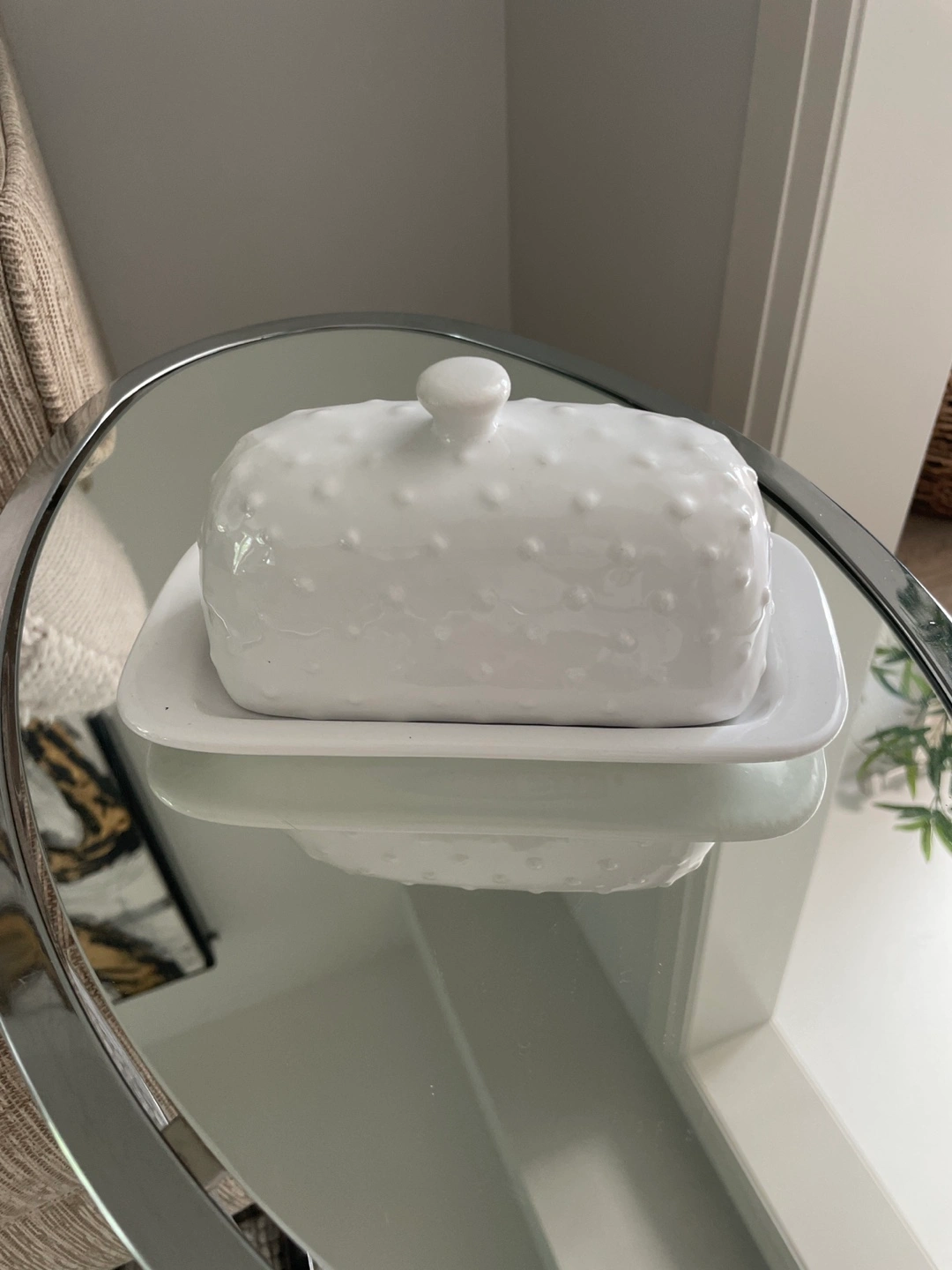 Here's a lovely white ceramic butter dish with a lid! It's perfect for keeping your butter fresh and adds a touch of elegance to your table. It's new condition … never used and ready for a new home