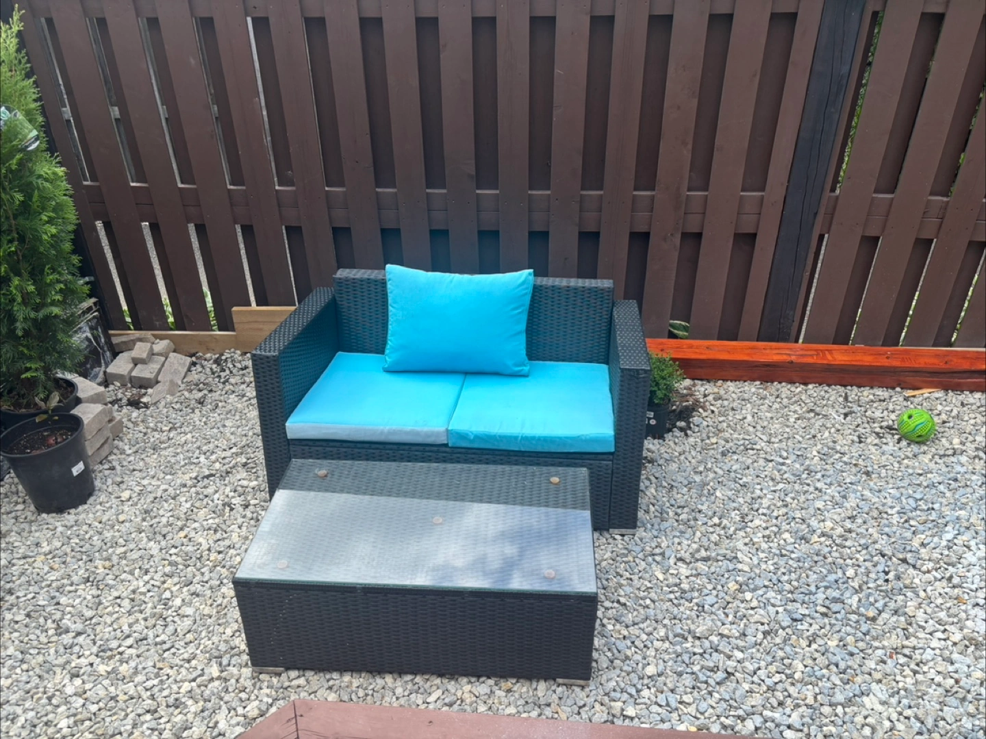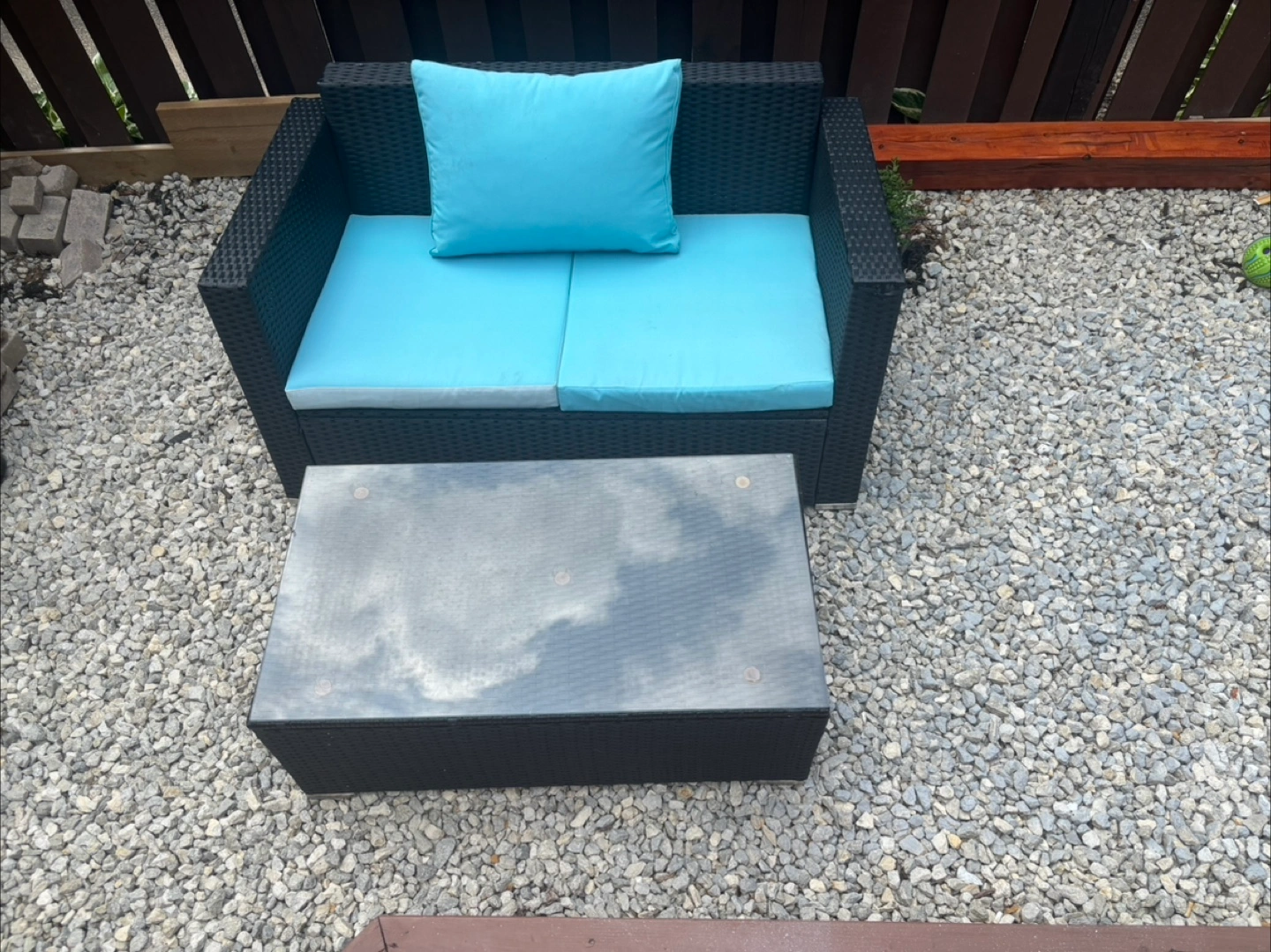Selling a charming outdoor wicker patio set! It includes a comfortable chair with light blue cushions and a matching table. Perfect for creating a cozy spot in your garden or on your balcony