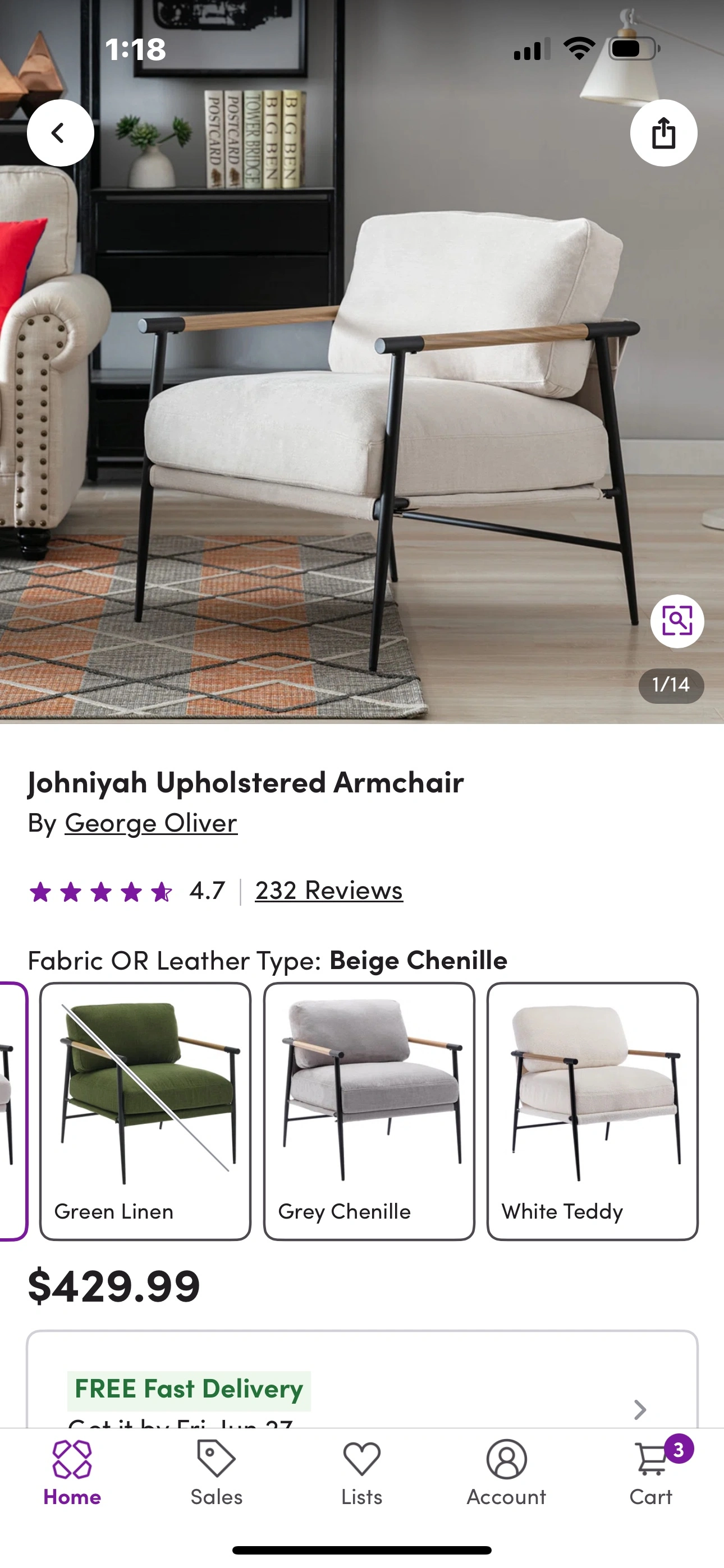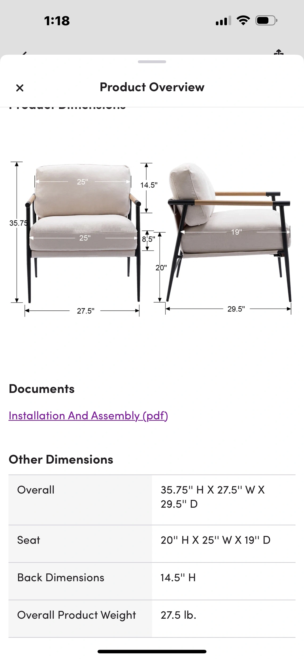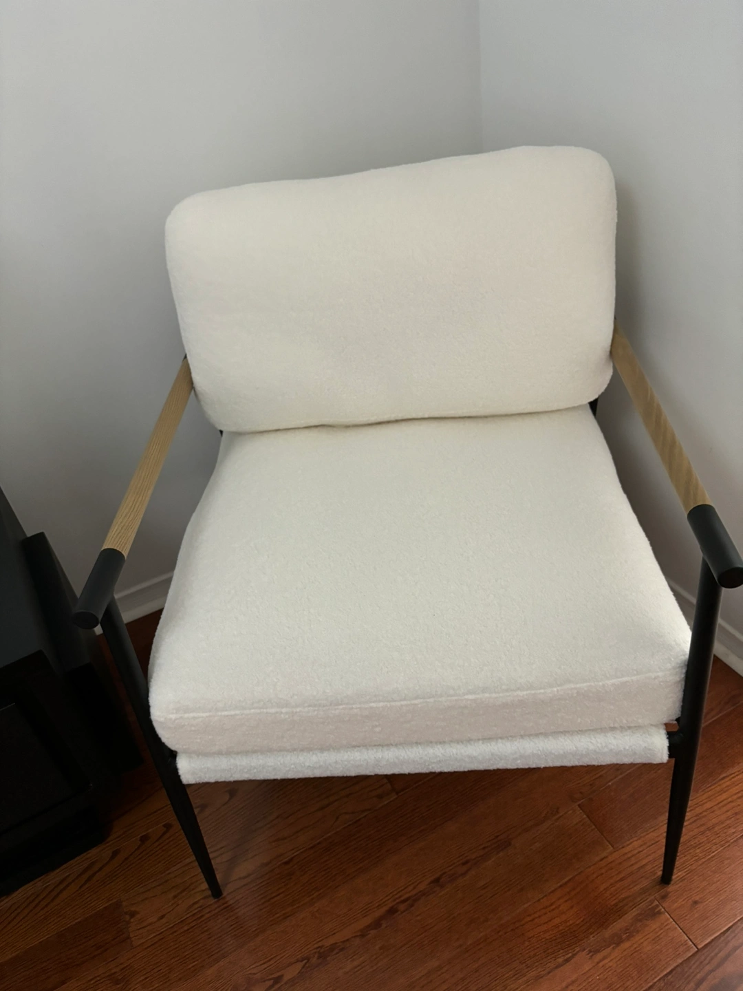 NEW upholstered Accent Chair with armrest and solid metal legs. bought from Wayfair but too large for the area. Refused to pay a charge to return it, so decided to sell. See last pictures for more info.