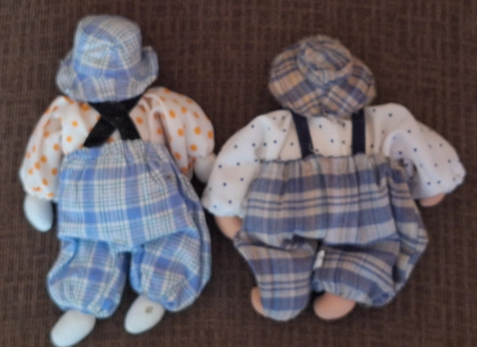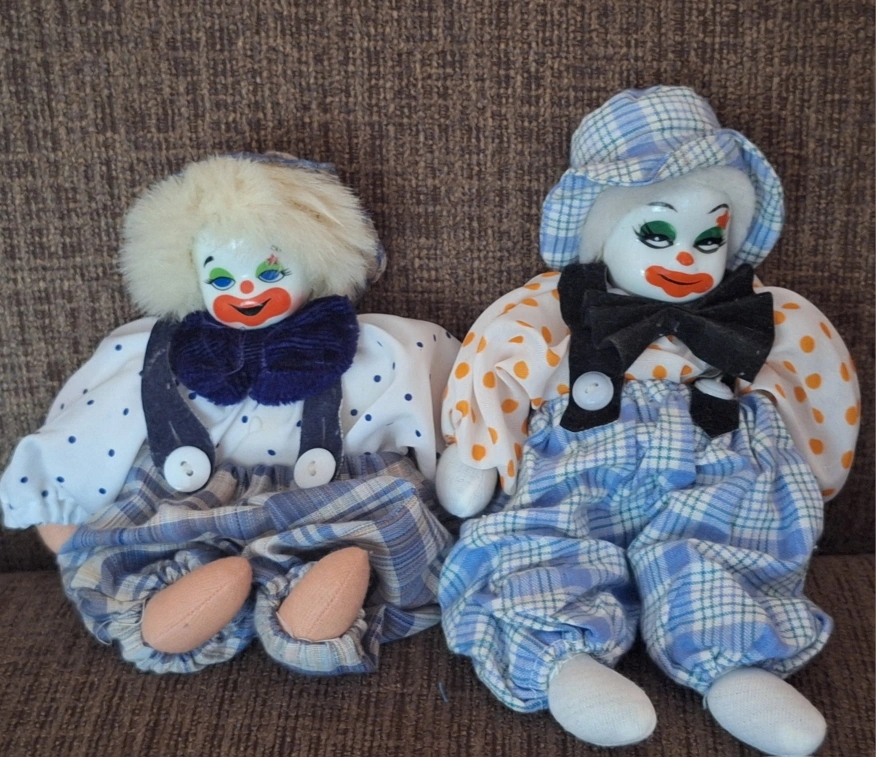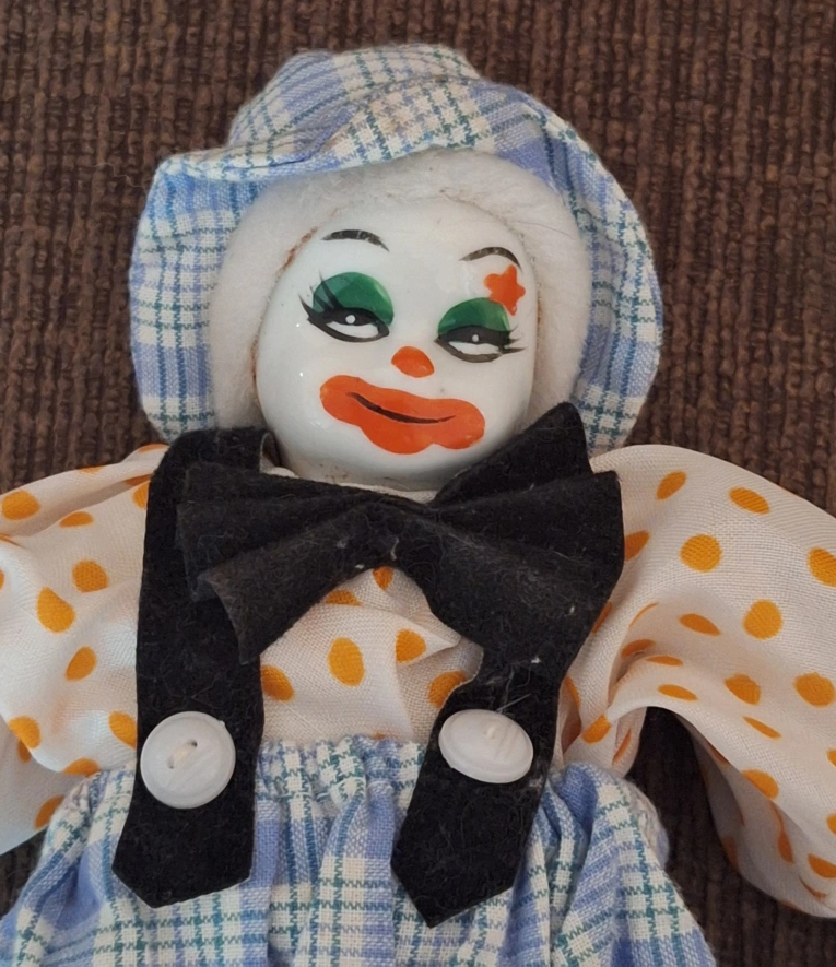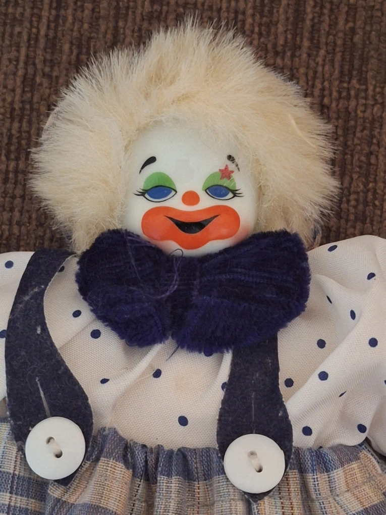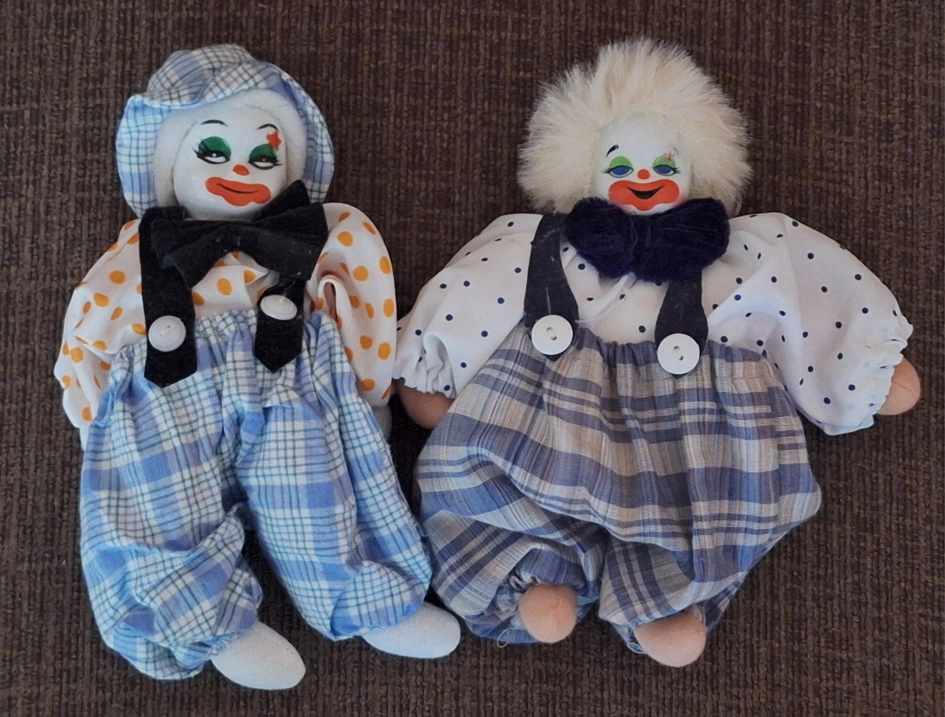 71Selling a pair of vintage clown dolls! 8 inches tall. They're dressed in polka dot and plaid outfits. One has a white wig and a purple bow tie, while the other has a matching hat and a black bow tie. They're in great condition and would make a lovely addition to any collection. price for 2.