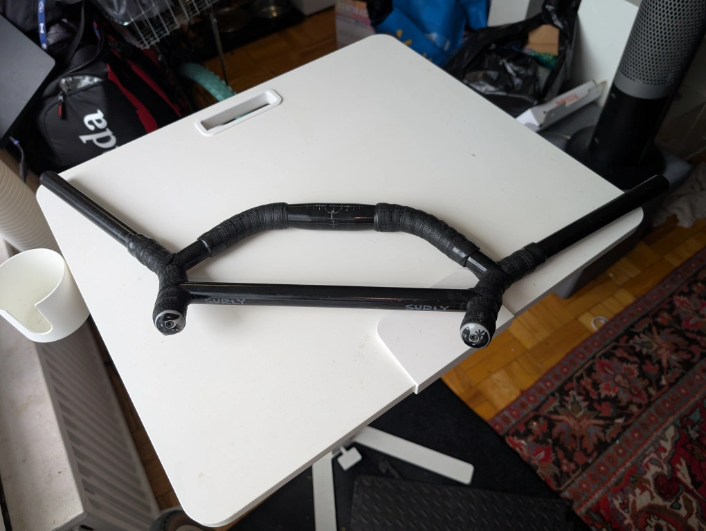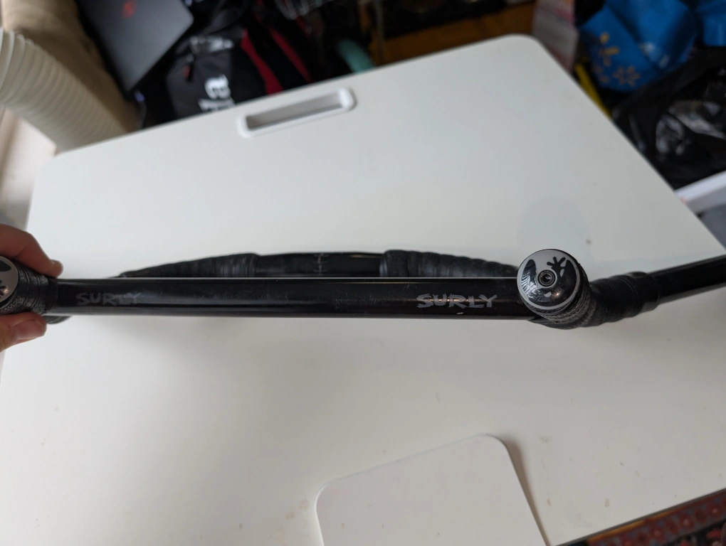 Selling a used Surly Moloko handlebar! It's black and has some handlebar tape on it. The diameter is 31.8mm. Great for bike touring or just cruising around town!
