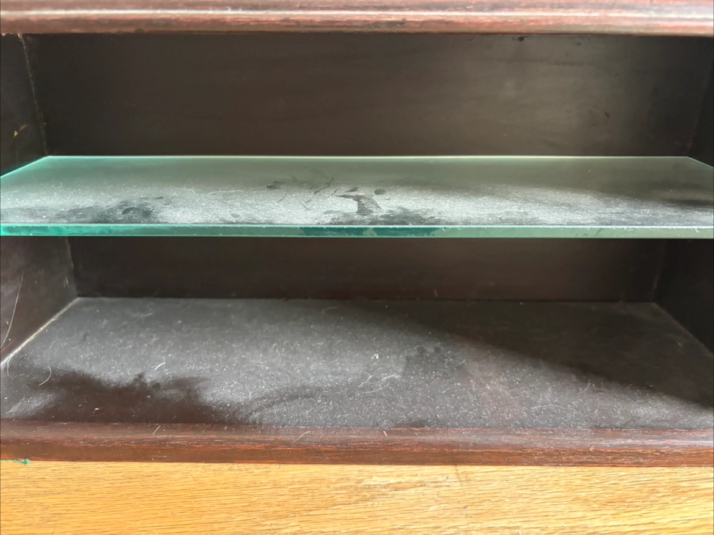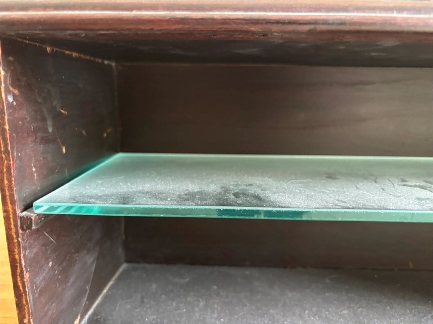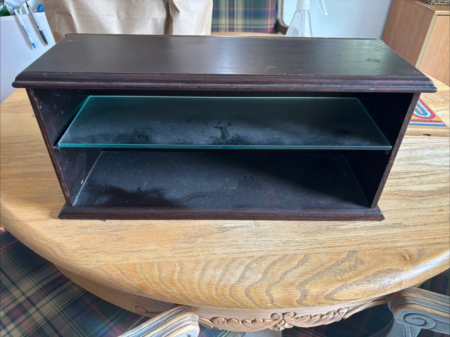 Selling a dark brown wood shelf that comes with a glass insert. It's in good condition and would be great for displaying items or for extra storage