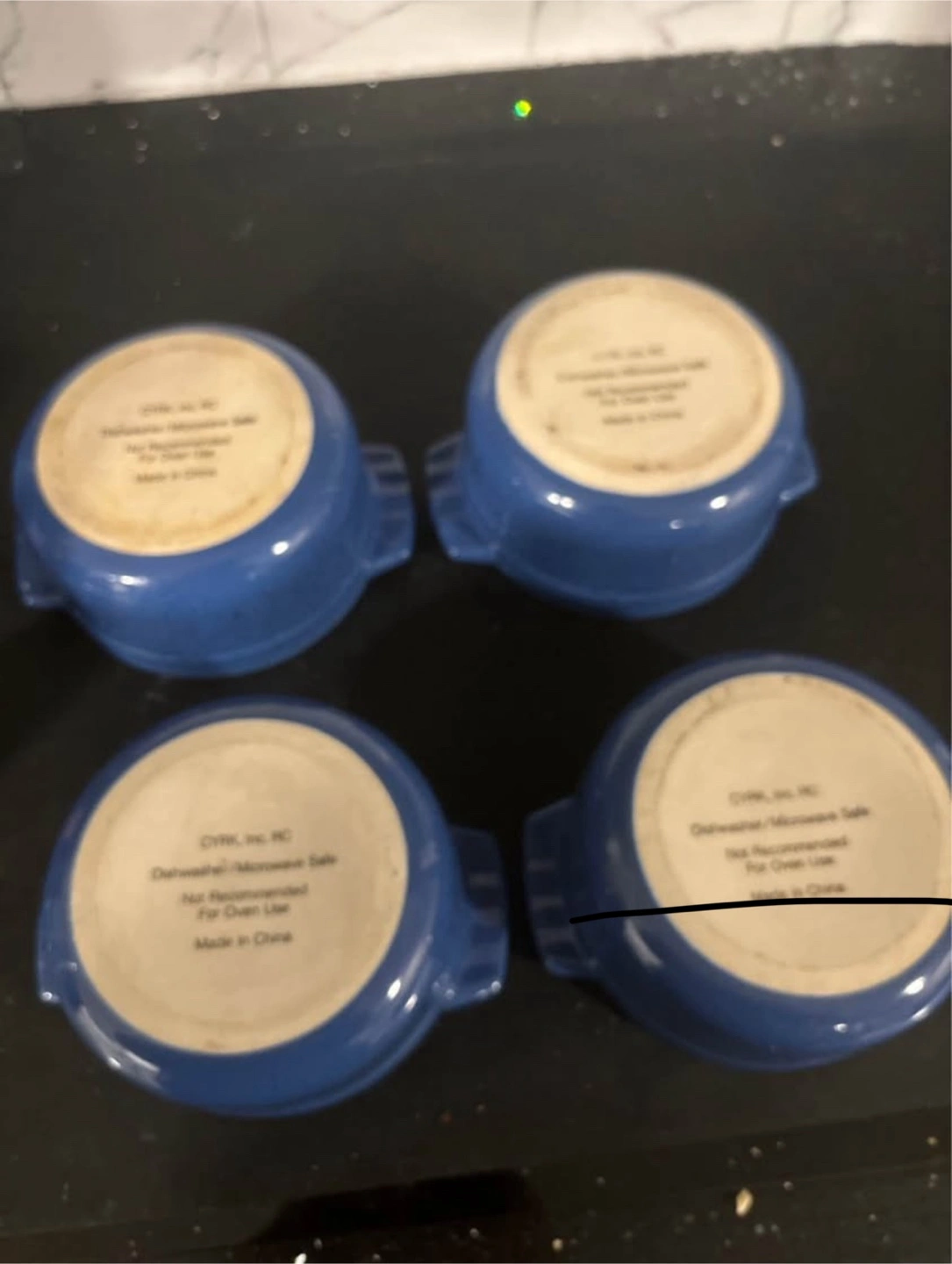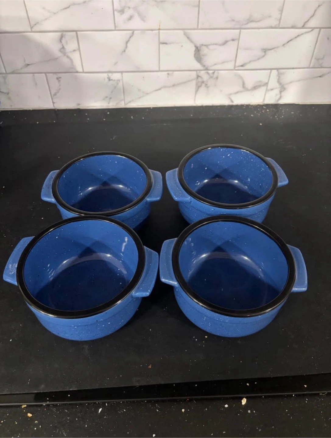 Selling a set of four blue bowls from CYRK Inc. They're dishwasher and microwave safe, but not recommended for oven use. Perfect for everyday meals!