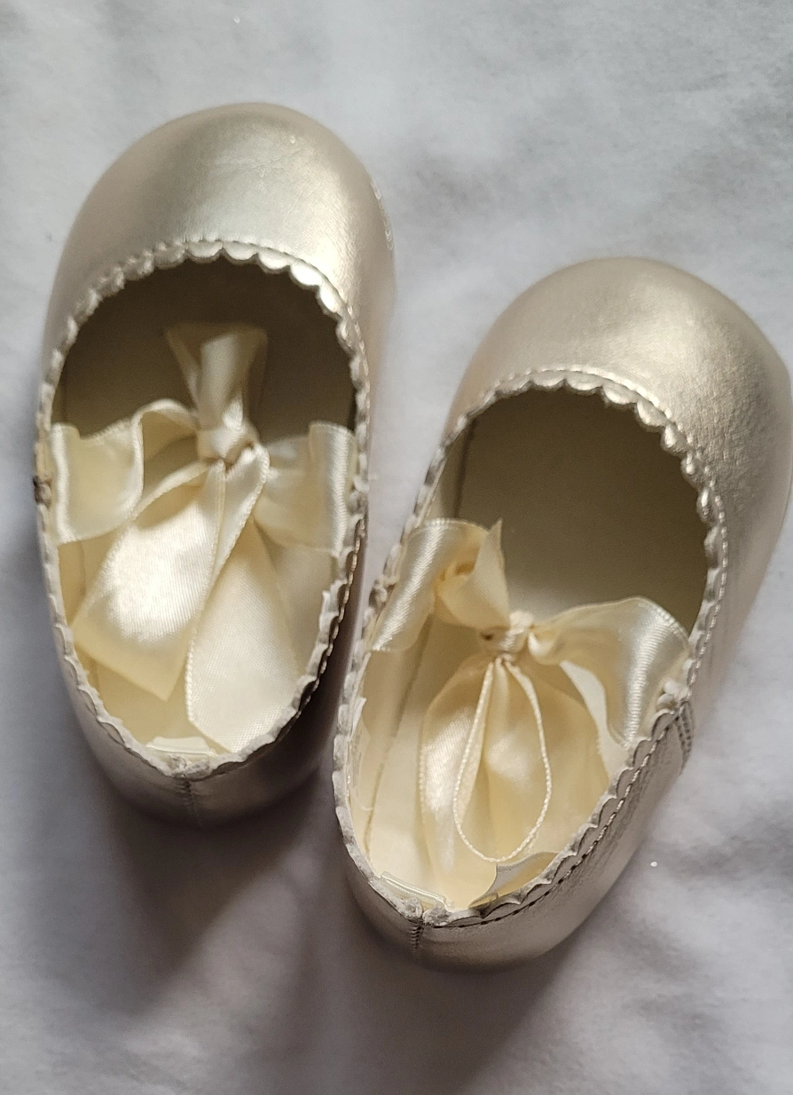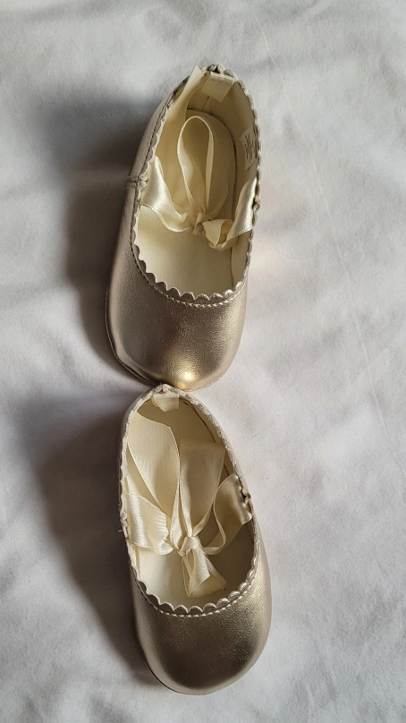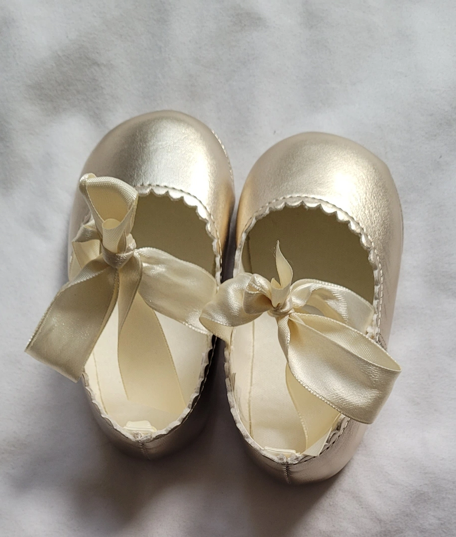 gold baby shoes in a size 4! They have a cute ribbon detail and are perfect for a special occasion or just to dress up any outfit. The upper material is manmade