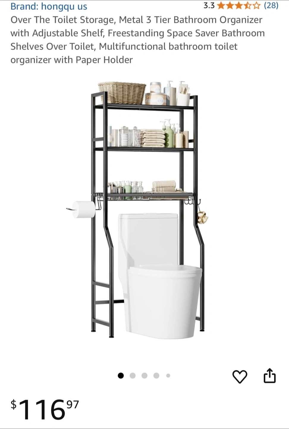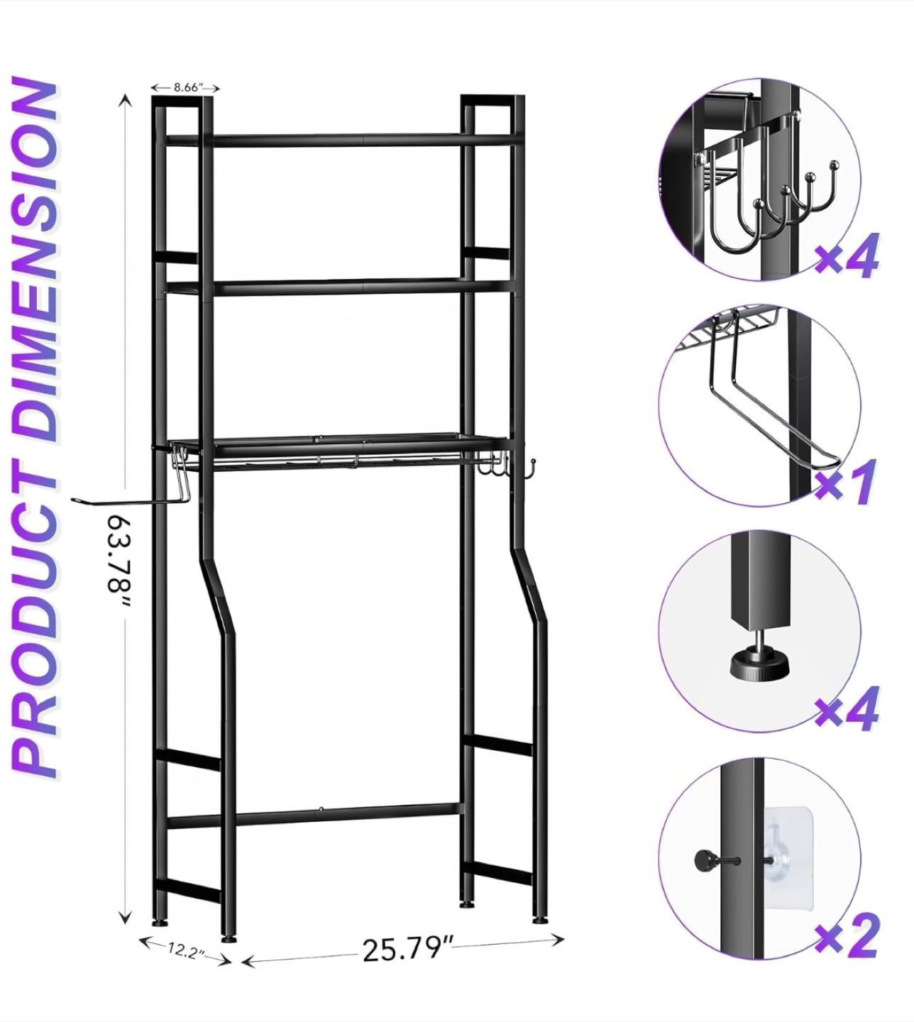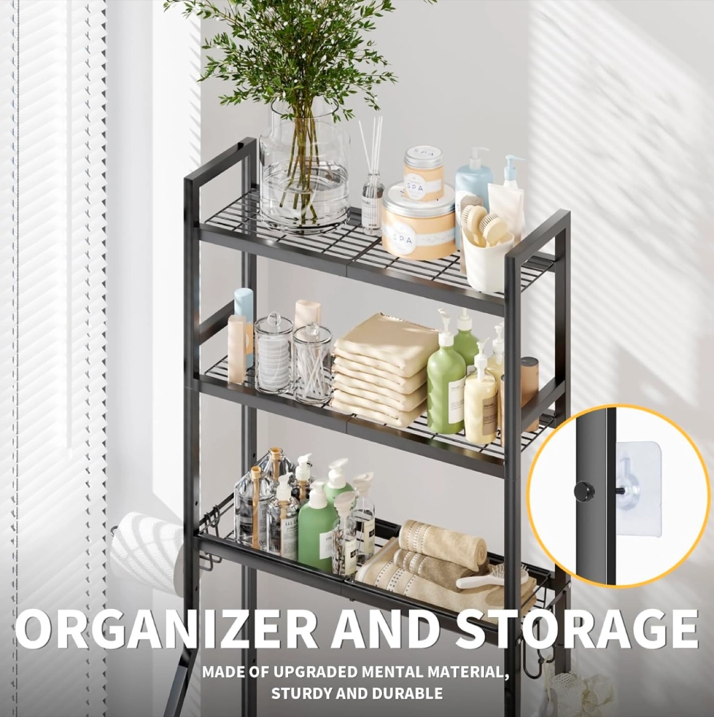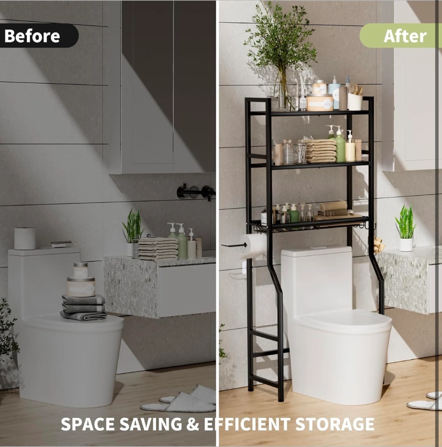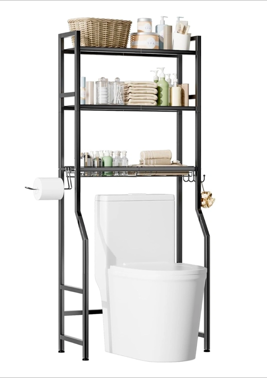 This black over-the-toilet bathroom shelf is a great way to add some extra storage to your bathroom! It's made of sturdy and durable metal material. It also comes with 4 hooks, 1 towel rack, and 2 adhesive pads. It's a space-saving and efficient storage solution!