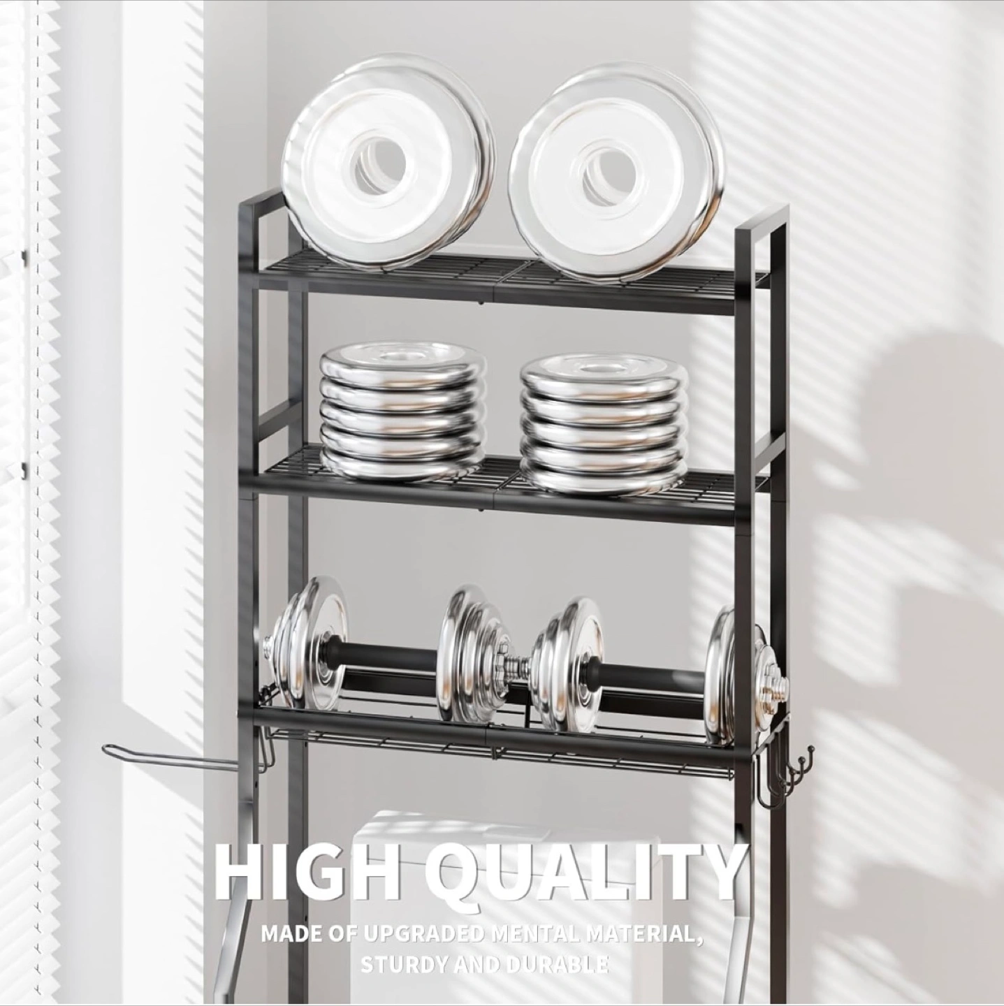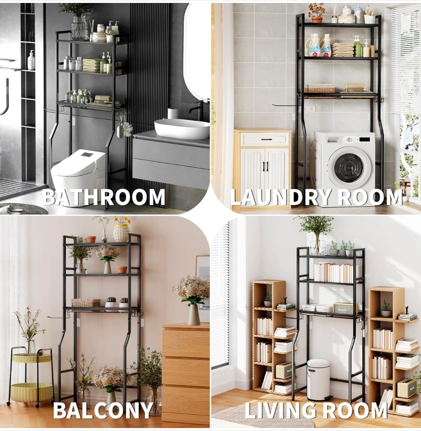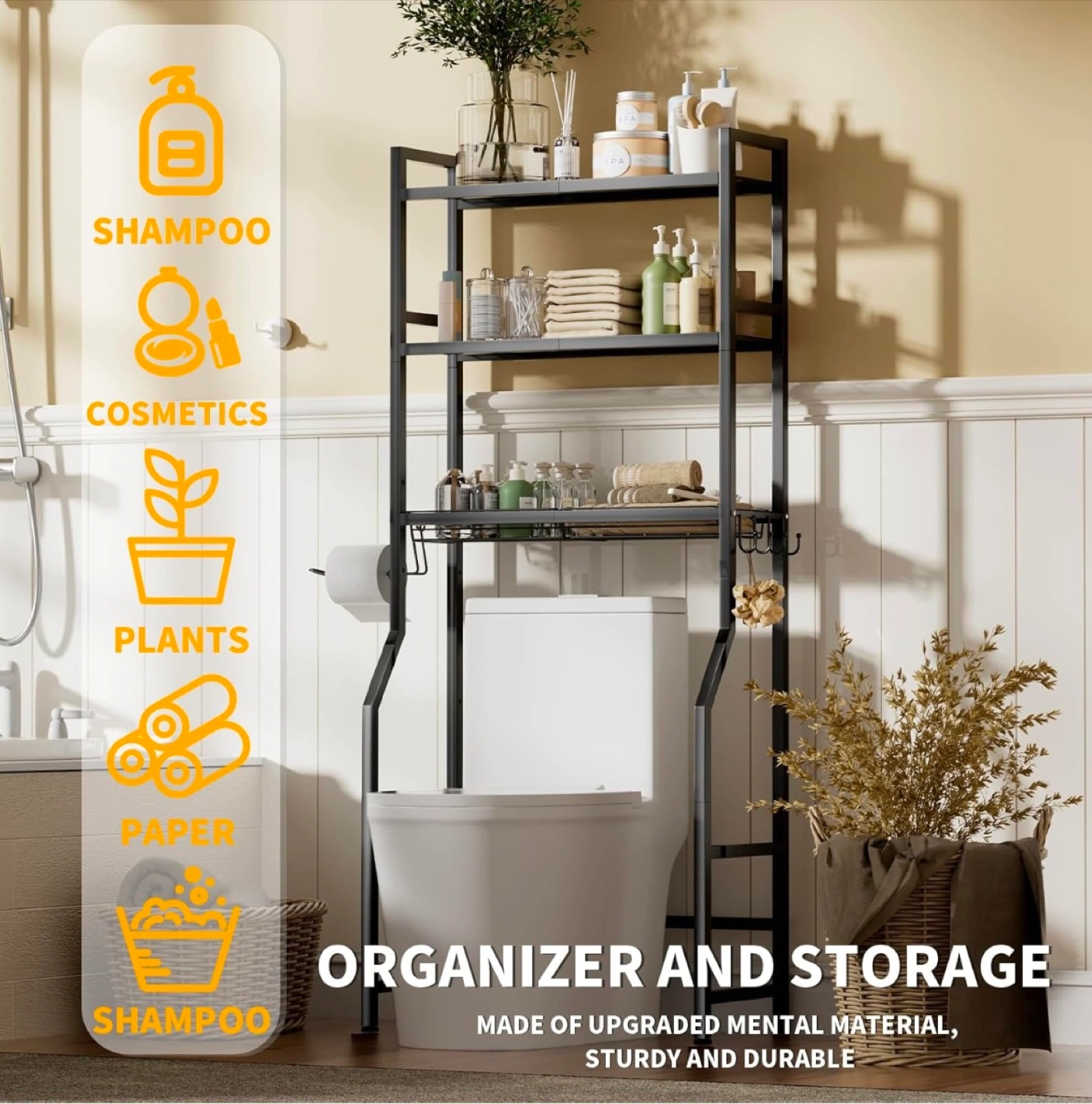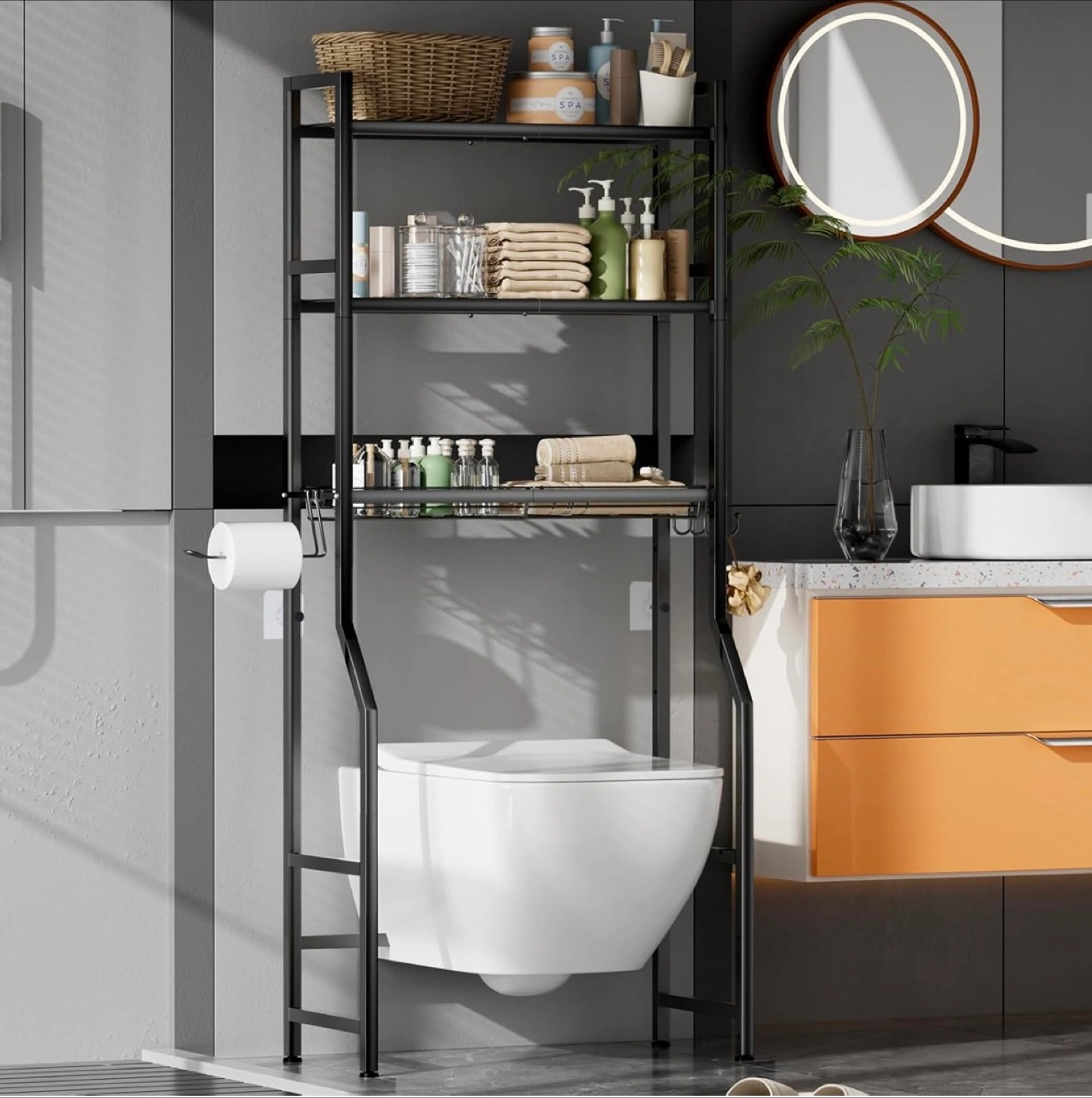 This black over-the-toilet bathroom shelf is a great way to add some extra storage to your bathroom! It's made of sturdy and durable metal material. It also comes with 4 hooks, 1 towel rack, and 2 adhesive pads. It's a space-saving and efficient storage solution!
