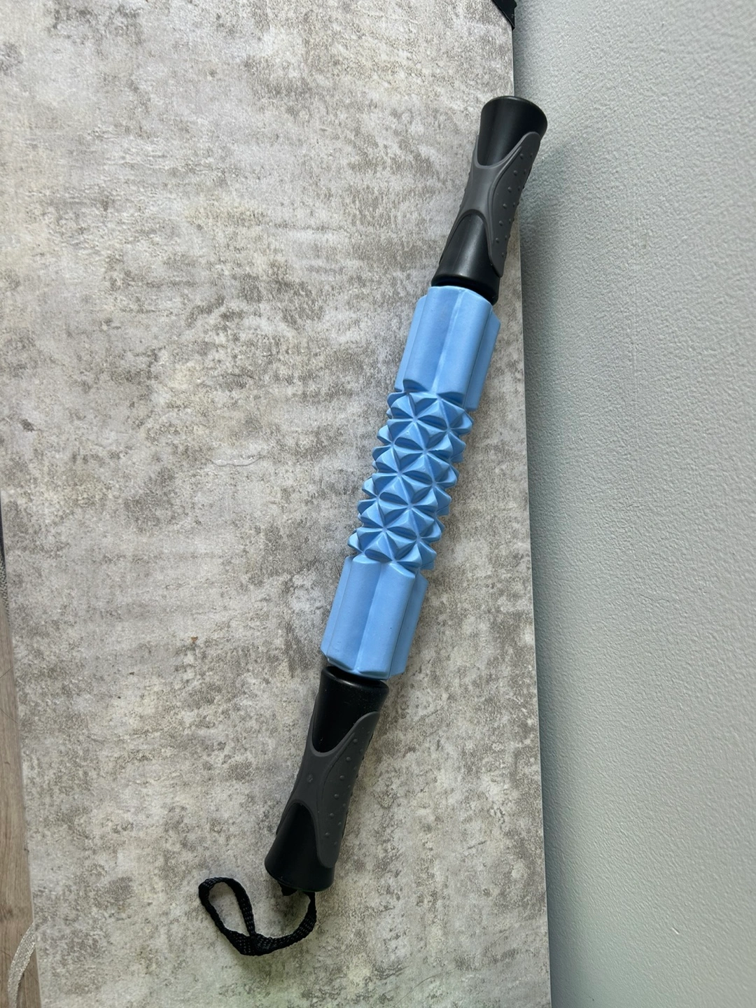 A massage roller stick in blue and black. It is great for muscle recovery and relaxation after workouts. It's lightweight and portable, making it easy to take with you to the gym or on trips. Feel free to message me if you're interested!