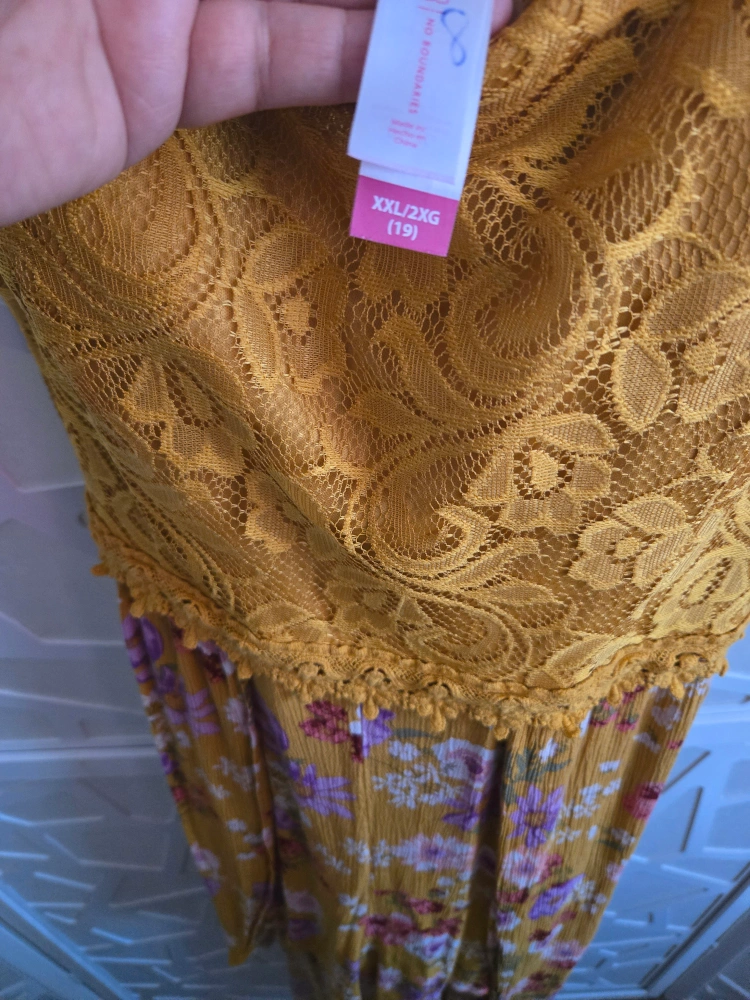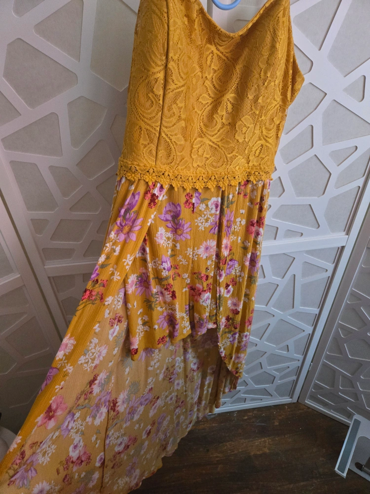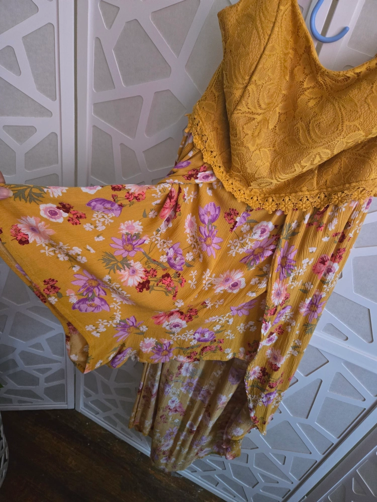 86This is a yellow floral jumpsuit from No Boundaries in size XXL. It features a lace top and a floral print bottom. It's in great condition and ready for a new home!