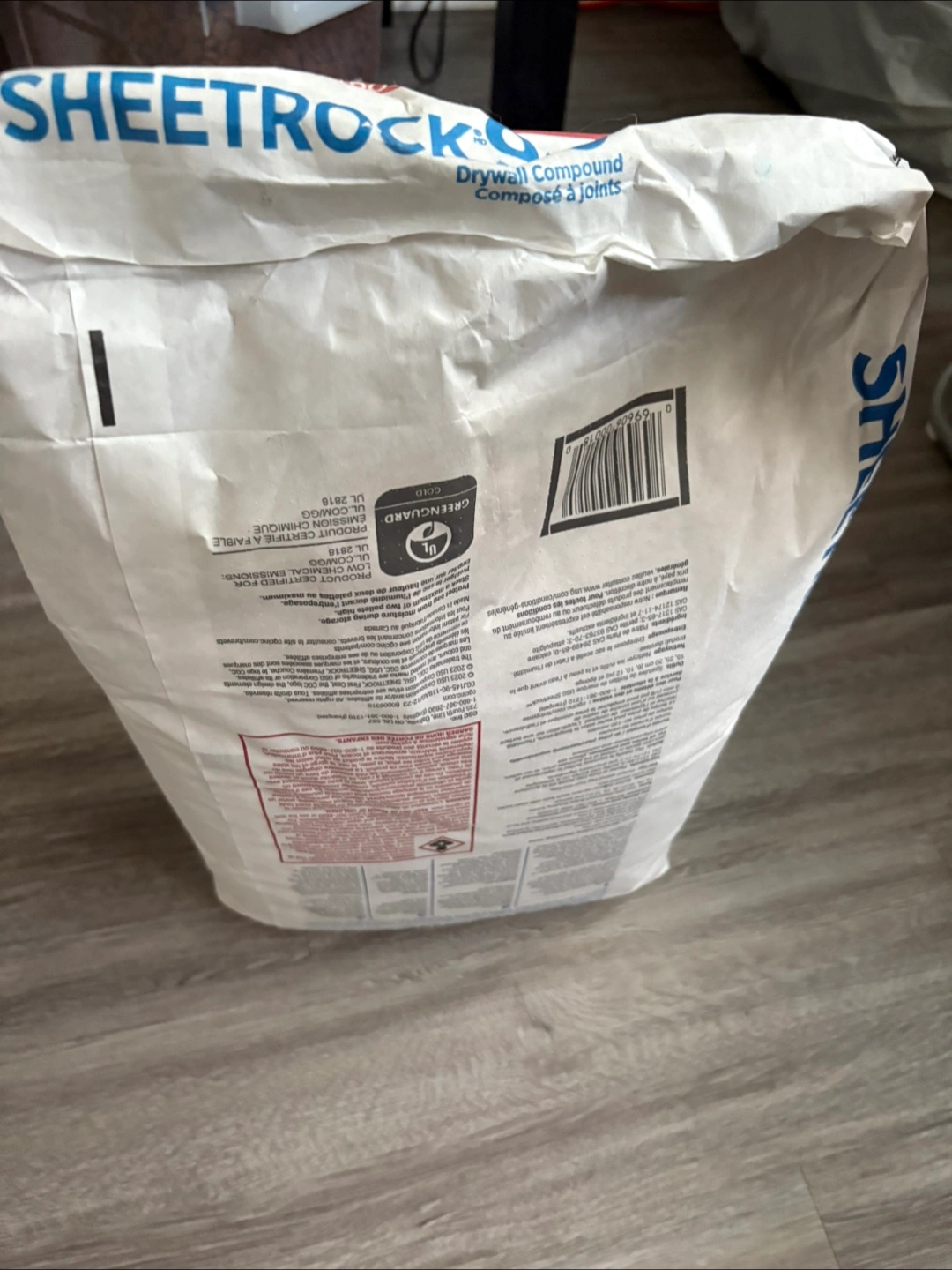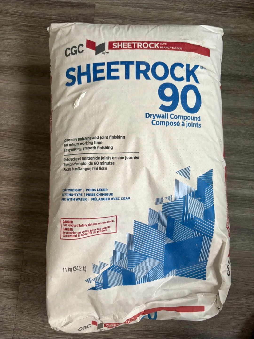 Selling a bag of Sheetrock 90 Drywall Compound. It's a one-day patching and joint finishing compound with a 60-minute working time. Easy mixing and smooth finishing. Lightweight and mixes with water. The bag contains 11 kg (24.2 lb).
