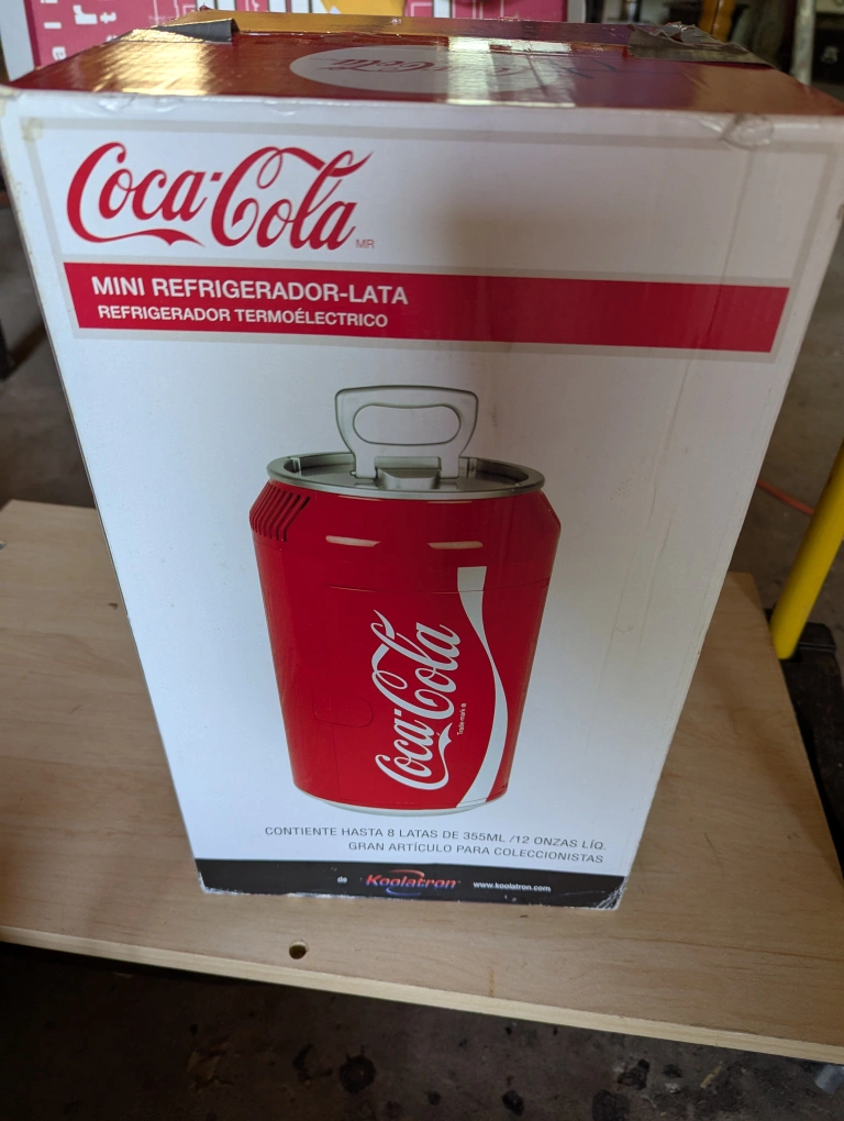 Selling a brand new Coca-Cola mini refrigerator! It's in the shape of a Coke can and comes in its original box. This thermoelectric refrigerator can hold up to 8 cans (355ml/12oz each). A great item for collectors!