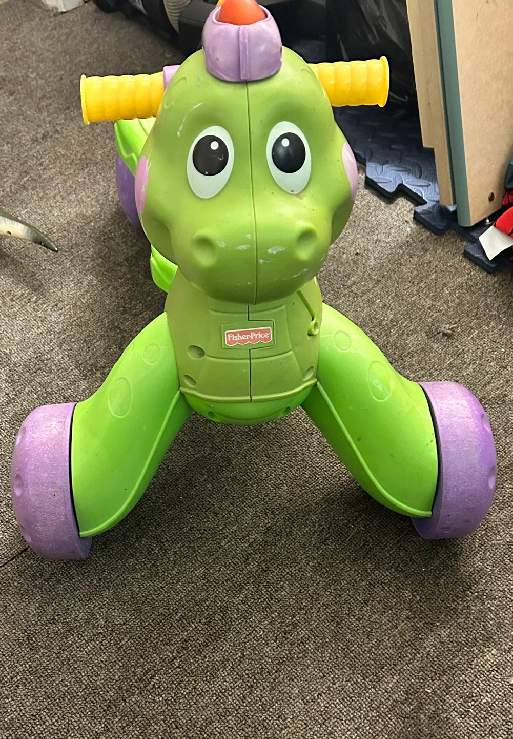 Selling a cute Fisher-Price Ride-on Dino! It's green and ready for a new home. It has been used, so it has some wear and tear, but still lots of fun left to be had! #freecycle