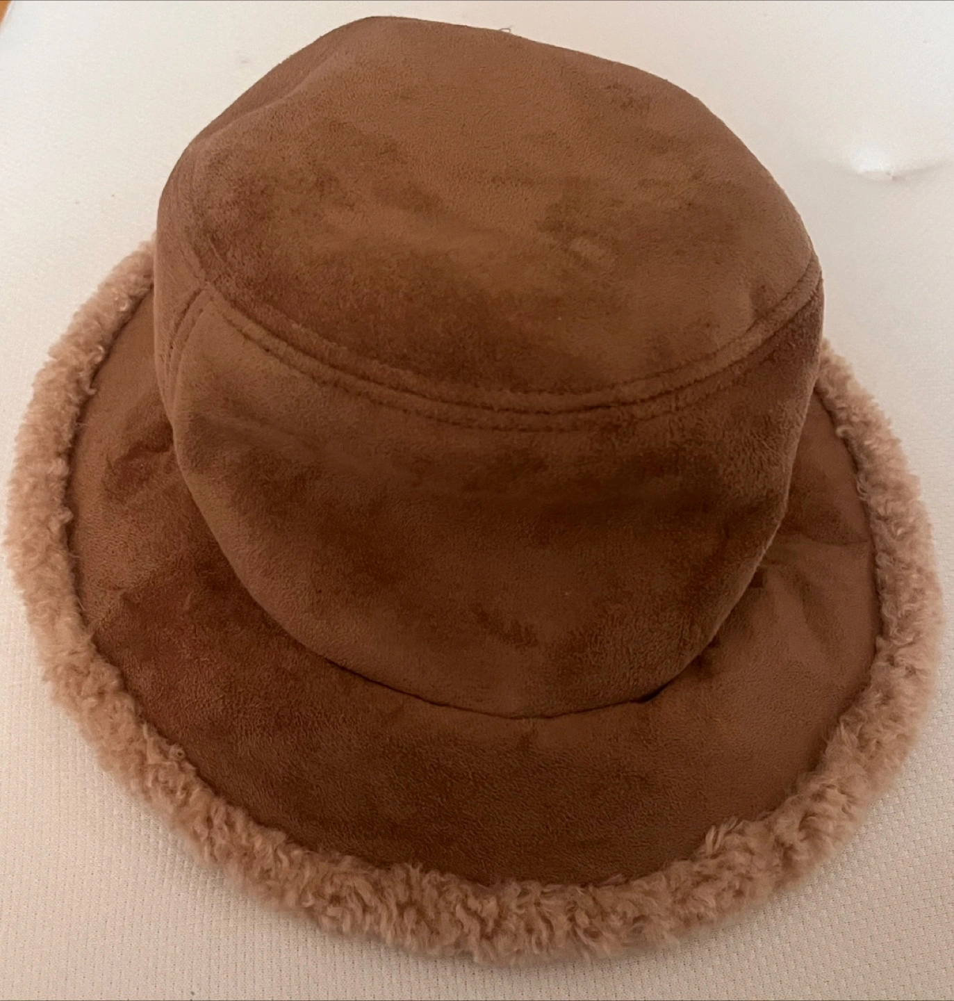 Selling a cute fuzzy brown bucket hat! It's in great condition and perfect for keeping your head warm and stylish. The hat is a soft, suede-like material on the outside with a fuzzy sherpa-like trim and lining.
