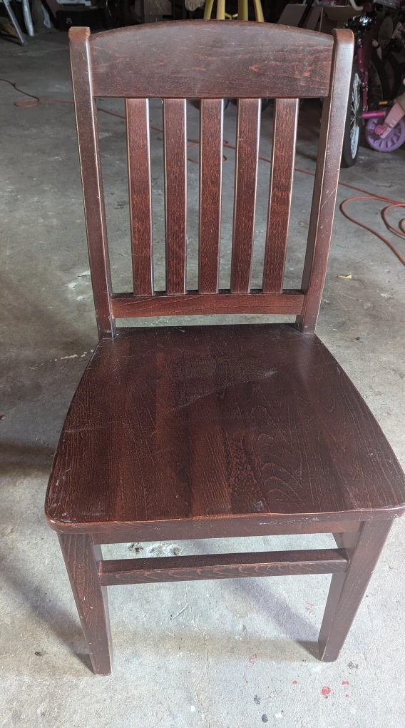 A sturdy wooden dining chair with a classic design. The chair is brown and has a solid build. It would be a great addition to any dining room or kitchen space. There are some signs of wear, but it's still in good condition for everyday use. Set of 6 15.00 each