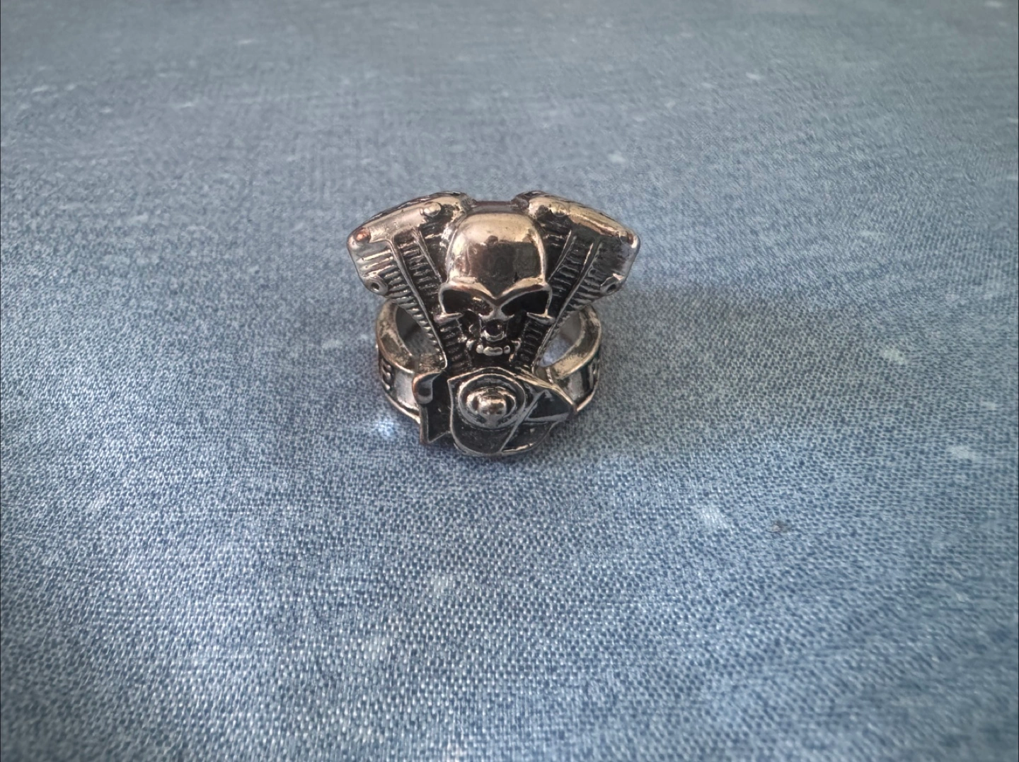 54Cool silver ring featuring a skull and engine design! It's in great condition and would make a unique addition to any collection