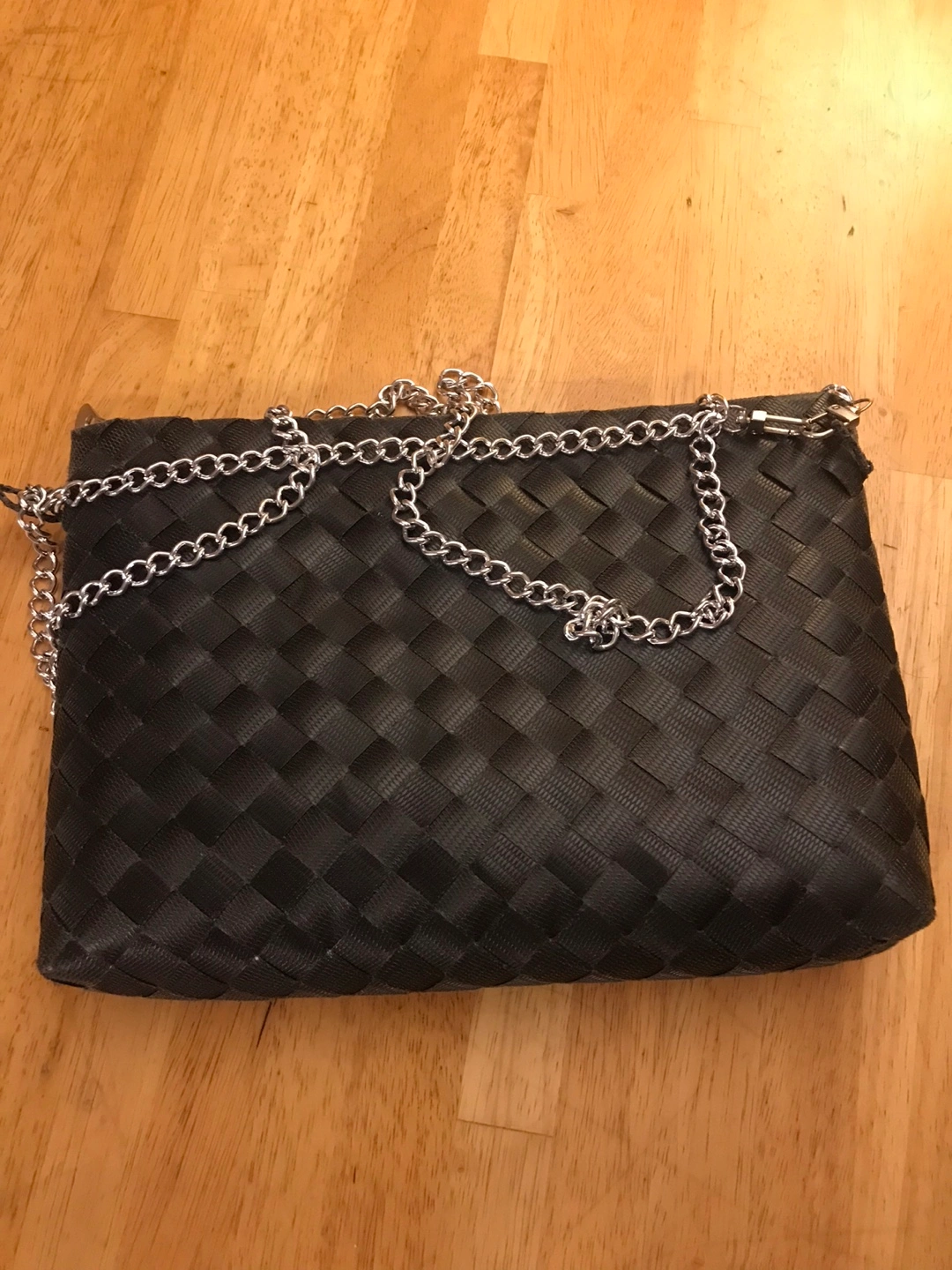Selling a stylish black woven clutch with a silver chain strap! It's in great condition and perfect for a night out or special occasion. The woven texture gives it a unique look, and the chain adds a touch of elegance