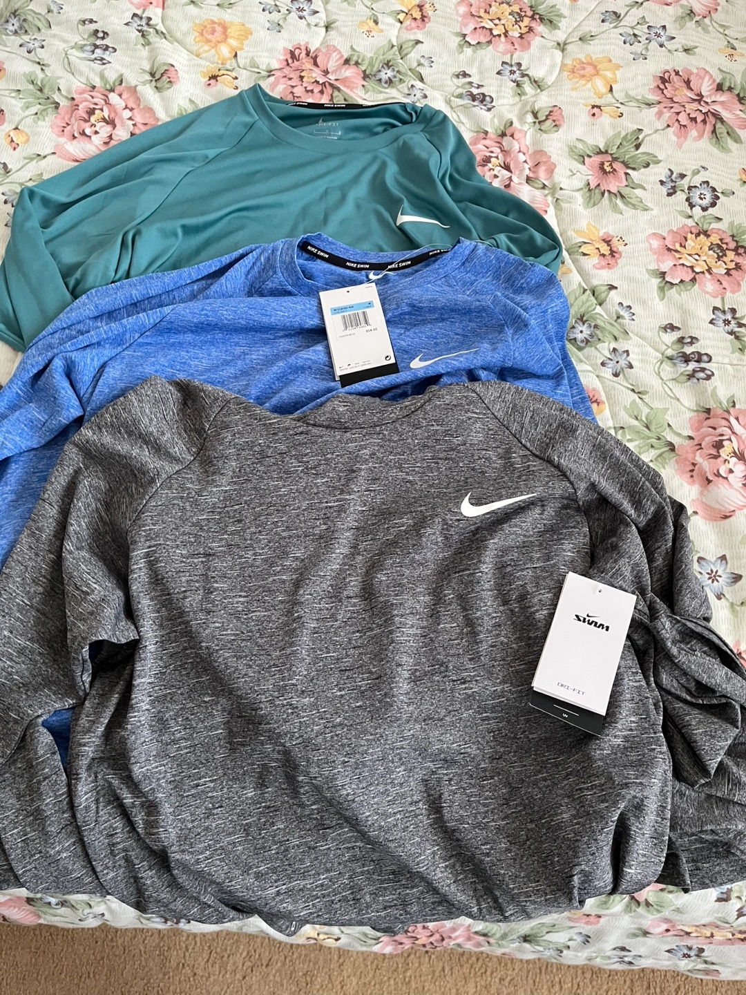 Selling a set of three Nike Dri-FIT long sleeve shirts. They come in blue, green, and grey. All are in great condition and ready for a new home! Brand new with tags $60 each