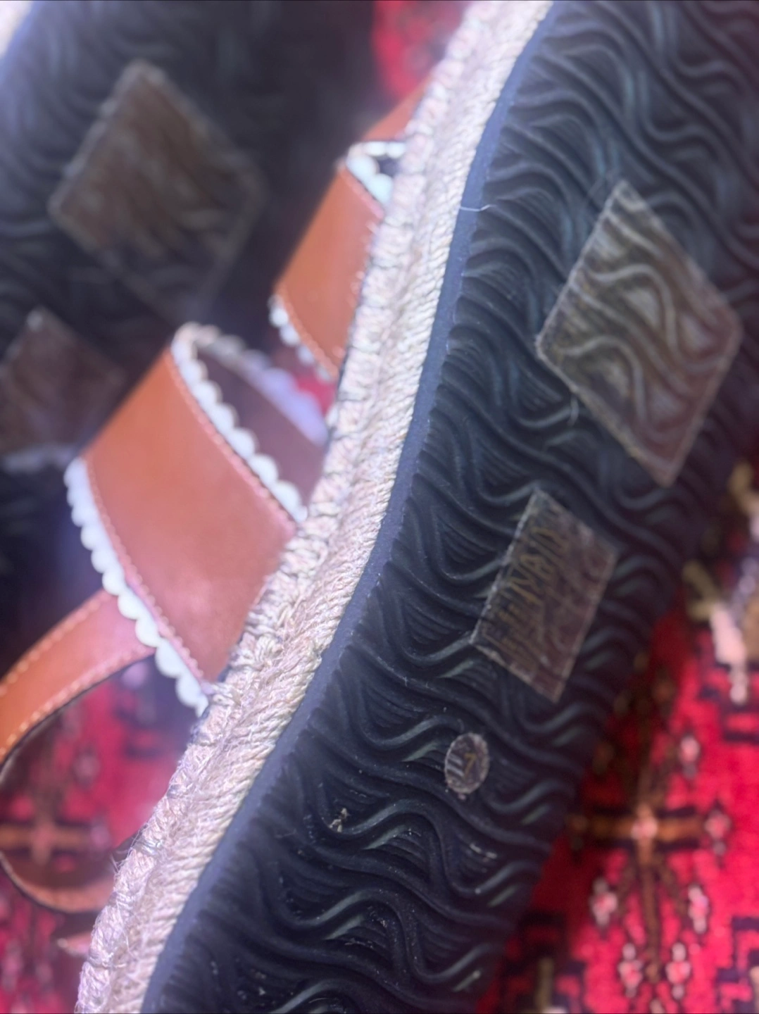 These are a pair of Joe Fresh sandals in size 7. They have a cognac brown colour with white scalloped trim and a jute-style sole. They are brand new in good condition and would be a great addition to your summer wardrobe! Super cute !!