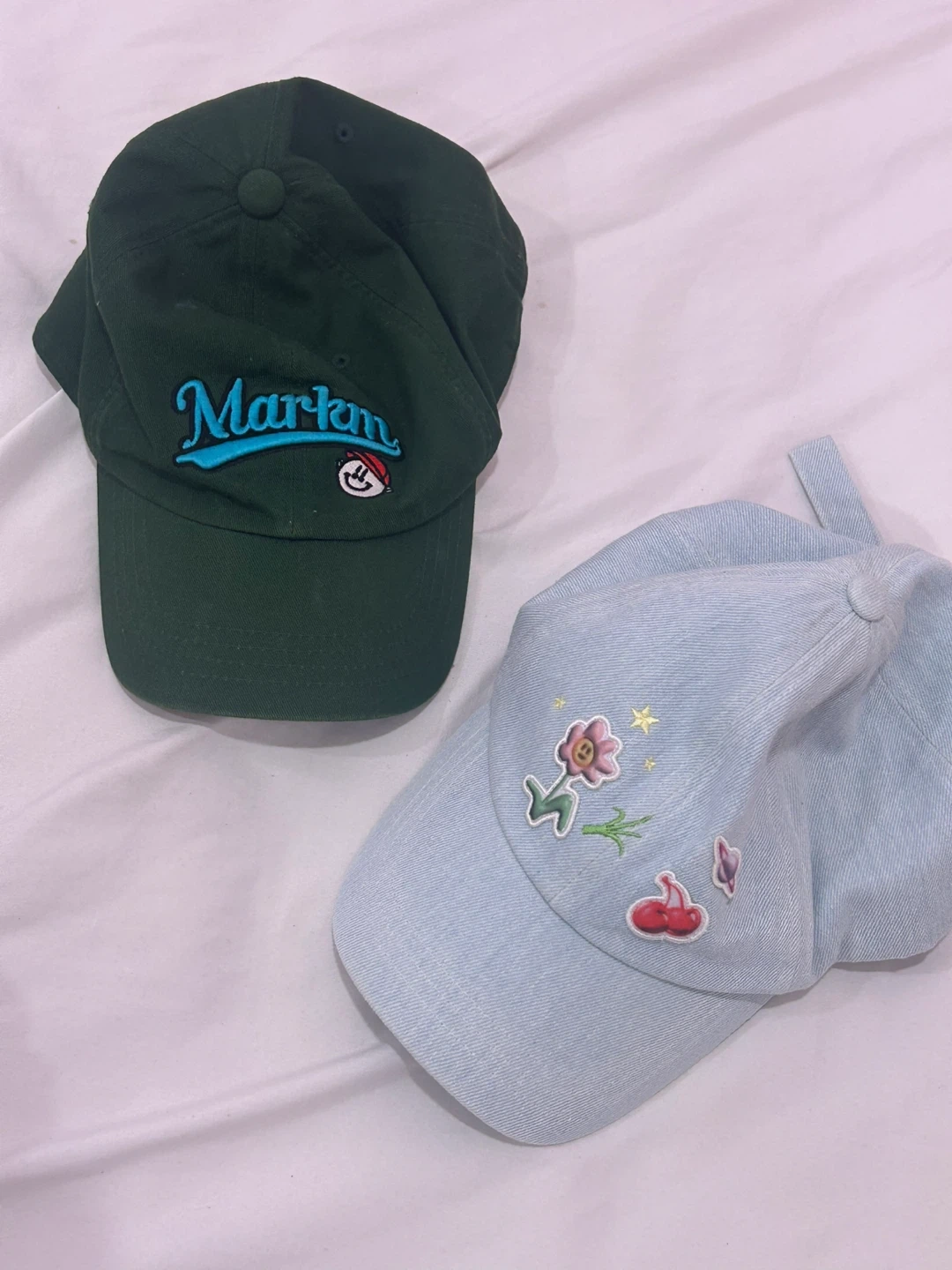 Two baseball caps are included in this lot. One is a dark green cap with 'Markm' embroidered in blue on the front. The other is a light blue denim cap with embroidered flowers and cherries. They're stylish and comfy!