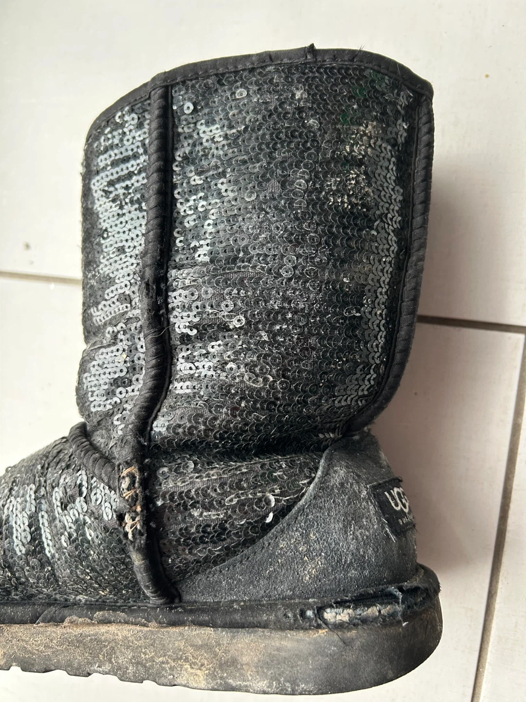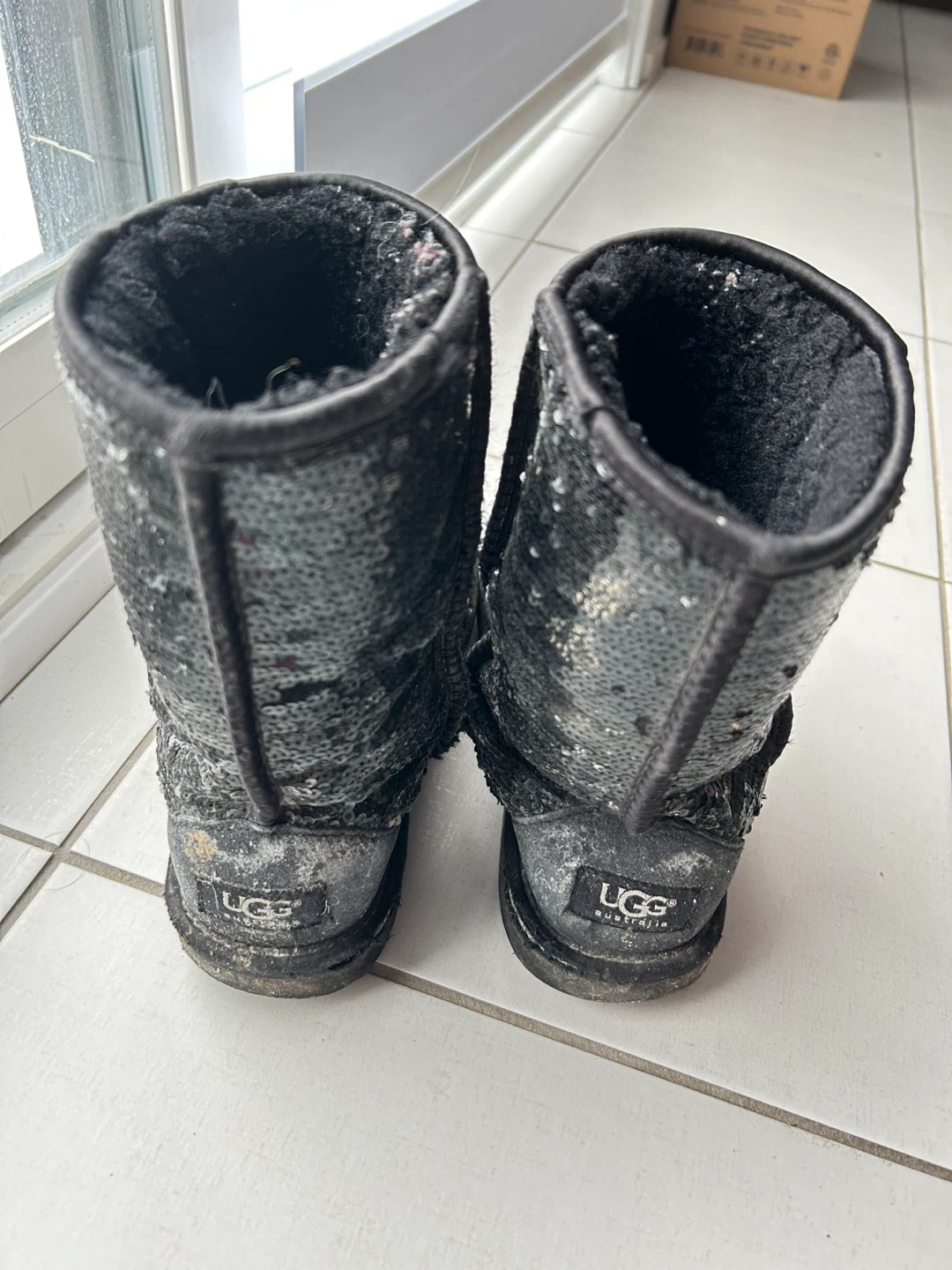 These are used women’s Ugg boots with black sequins, women's size 8.