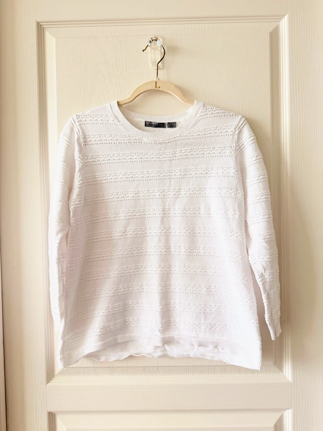 Selling a lovely sweater in white! It's a size large and looks to be in great condition. The knit pattern is really pretty and would be perfect for layering or wearing on its own.